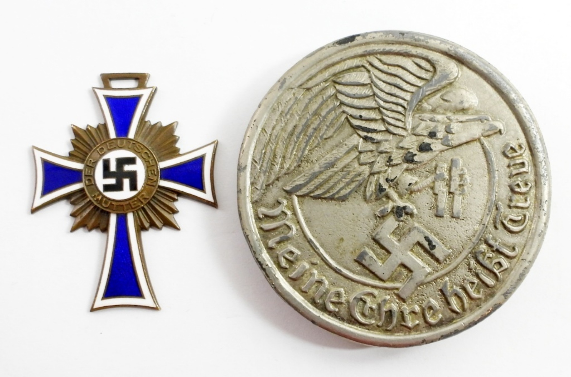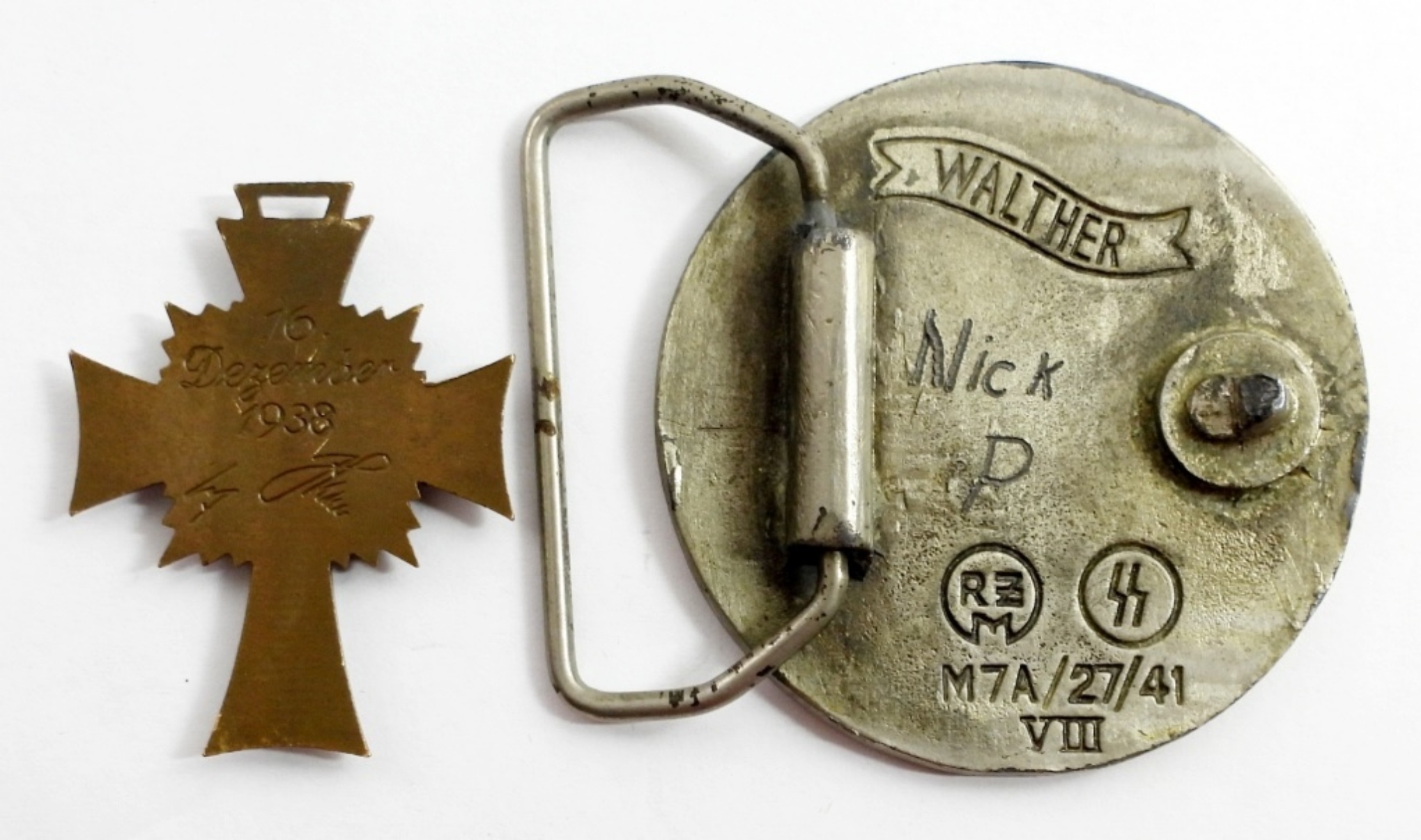 VINTAGE WWII GERMAN IRON CROSS BLUE AND WHITE ENAMEL AND A VINTAGE WALTHER GERMAN BELT BUCKEL