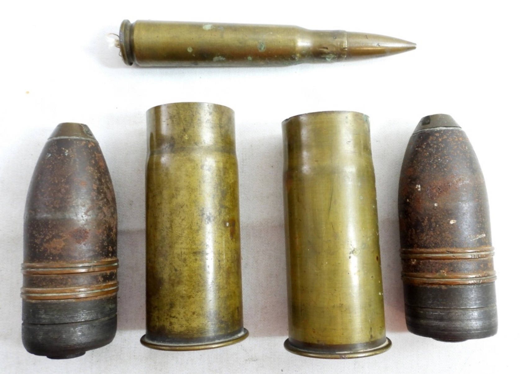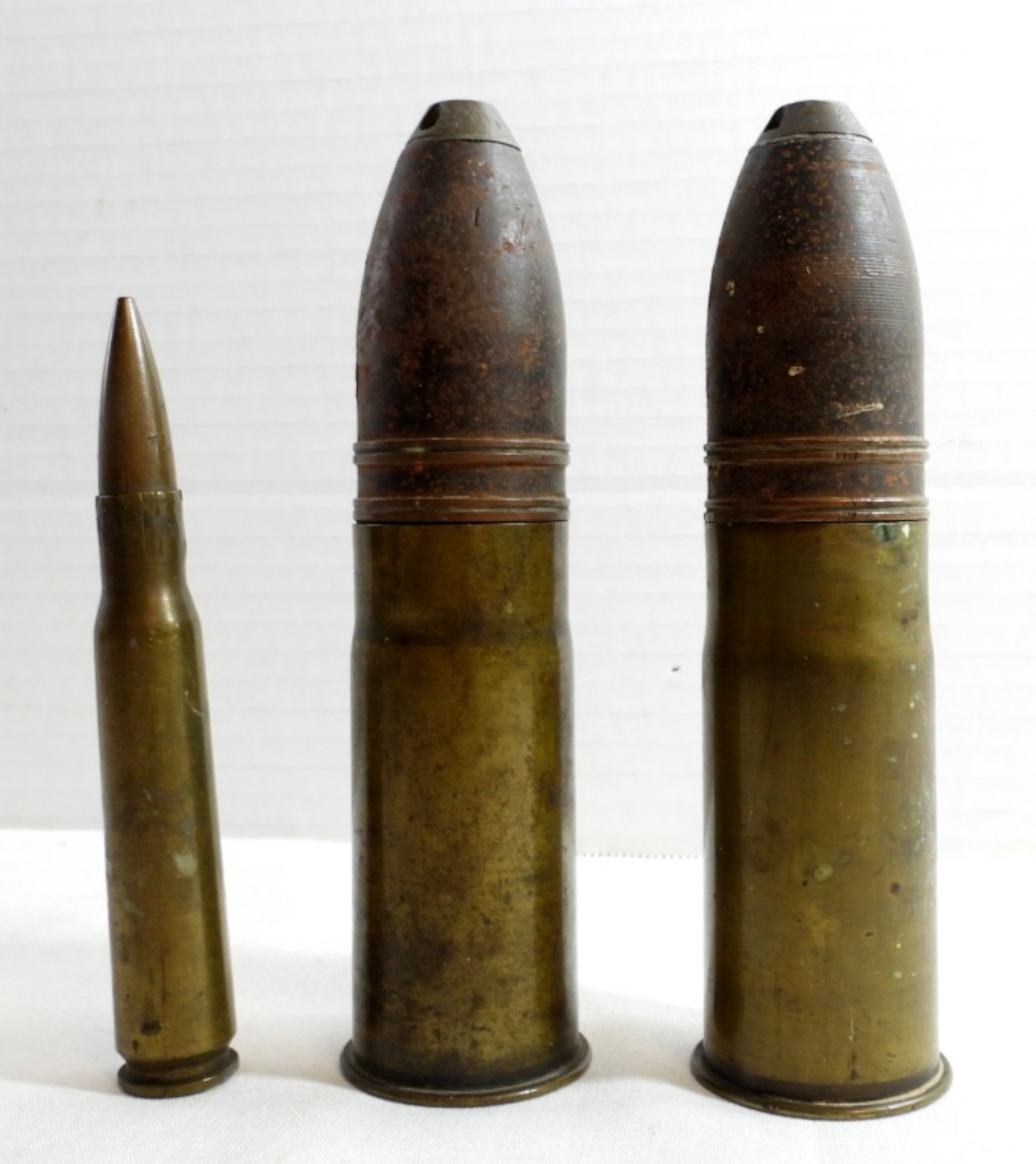 (2)VINTAGE WWI 37 MM BRASS TRENCH ROUNDS AND A VINTAGE BRASS BULLET