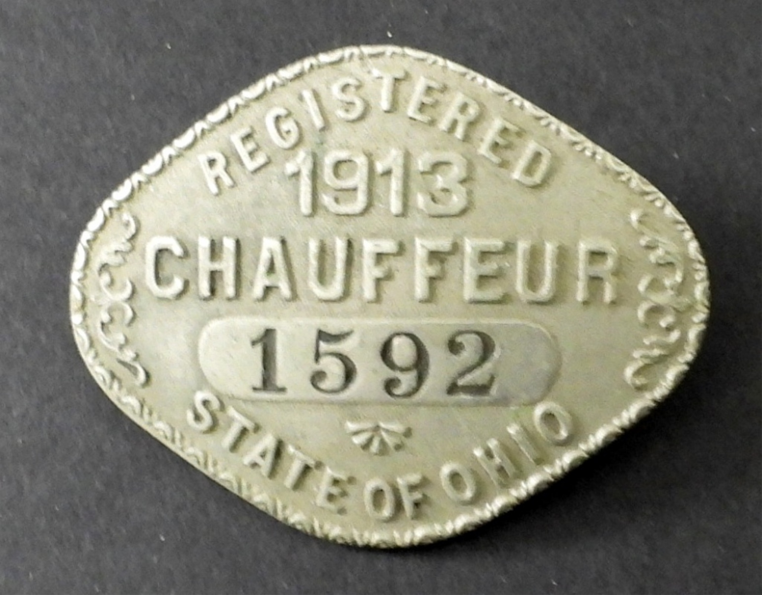 VINTAGE 1913 STATE OF OHIO REGISTERED CHAUFFEUR PIN #1592