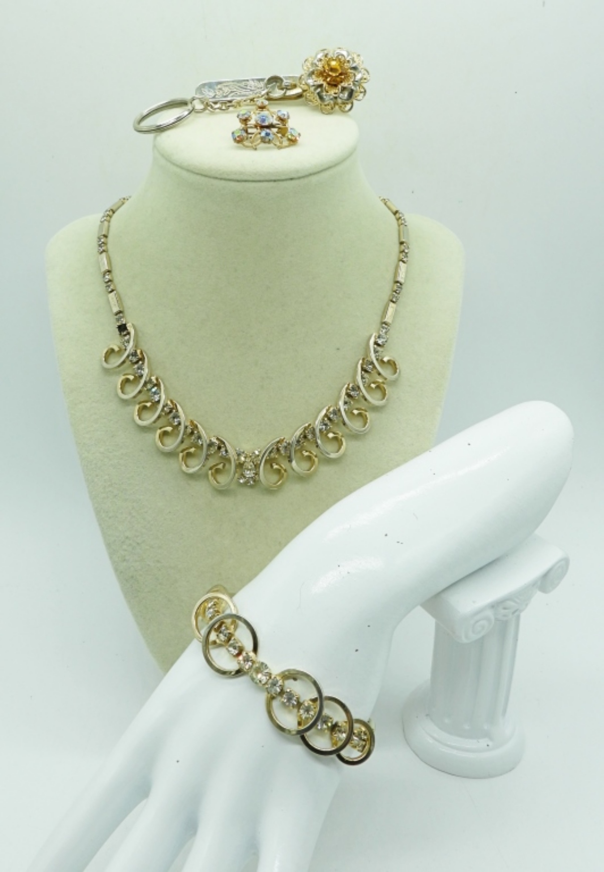 NECKLACE, 18″ BRACELET, 7″. SMALL BROOCH AND KEY FINDER KEYCHAIN CLIP WITH GEMSTONE.
