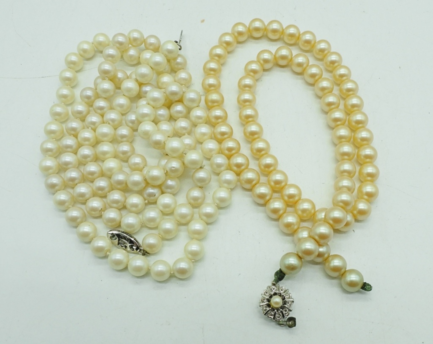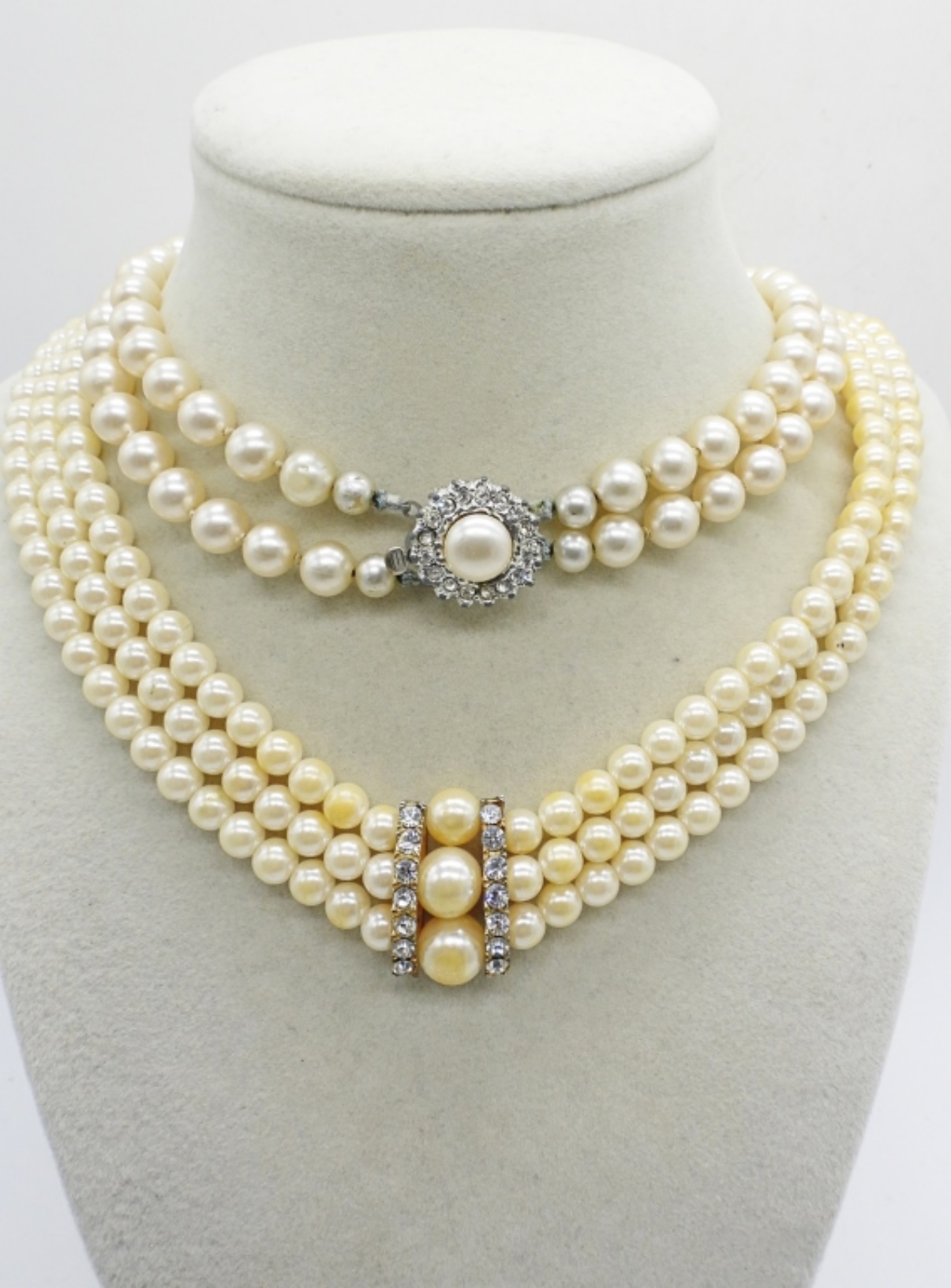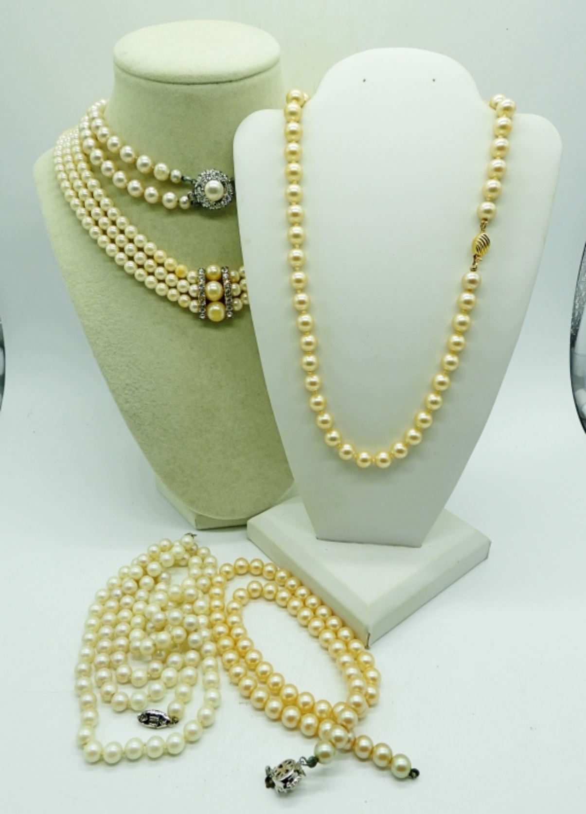 FIVE PEARL NECKLACES, ONE HAS A PARTIALLY MISSING CLASP. 18″-34″. VINTAGE & MODERN.