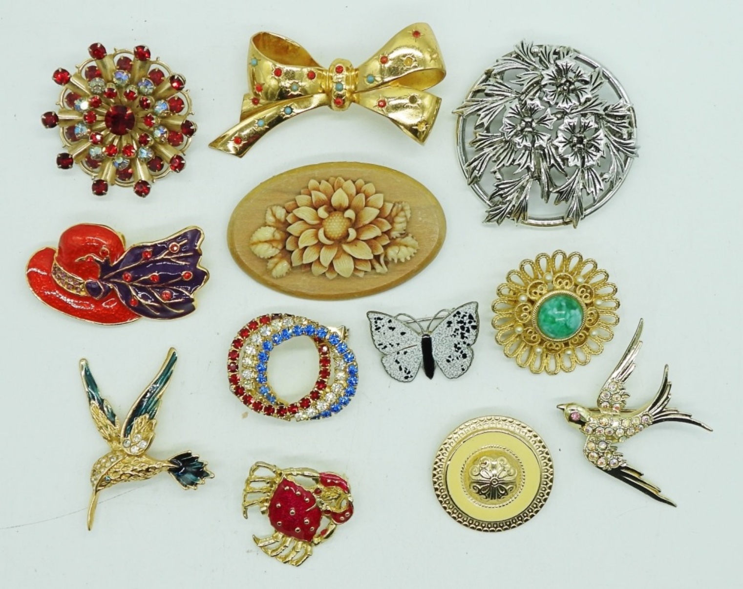 TWELVE VINTAGE & MODERN BROOCHES. VARIOUS STYLES & SIZES