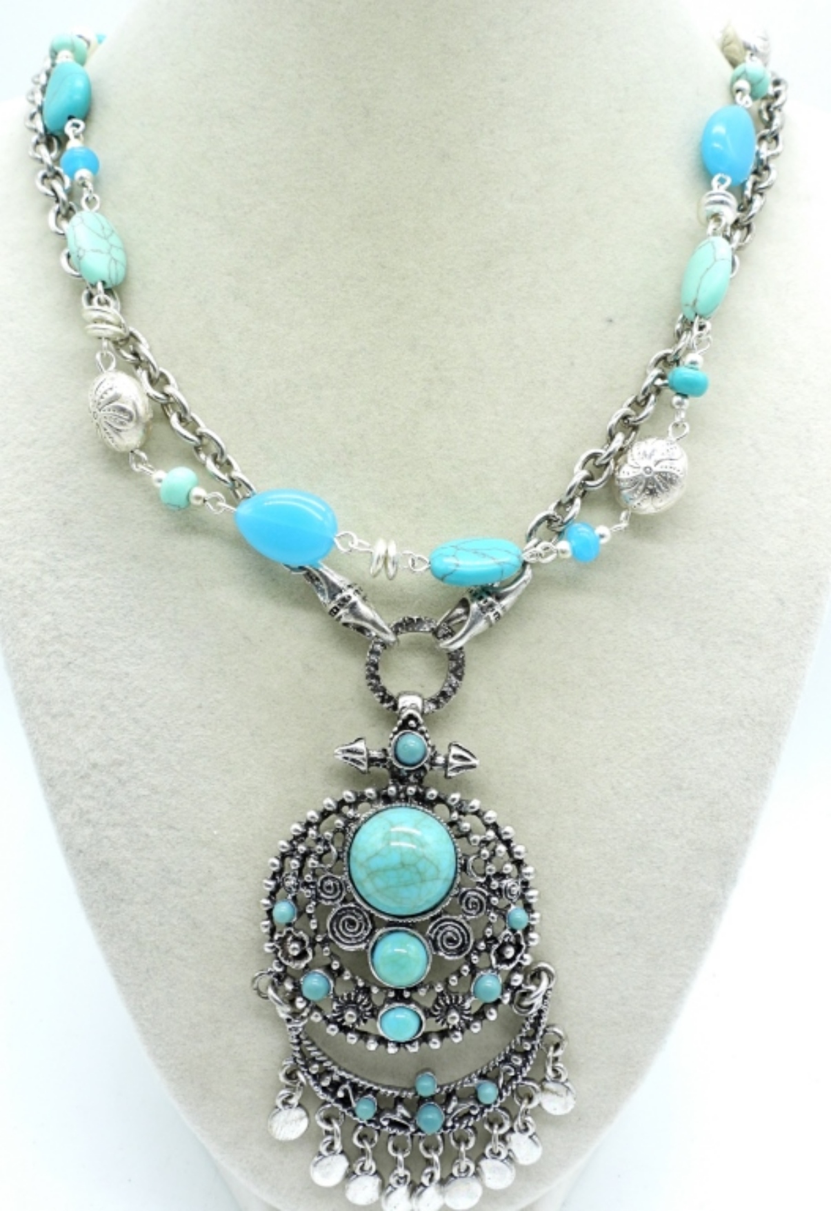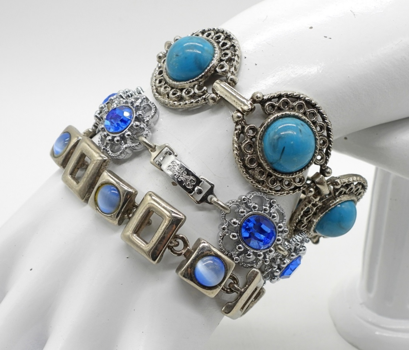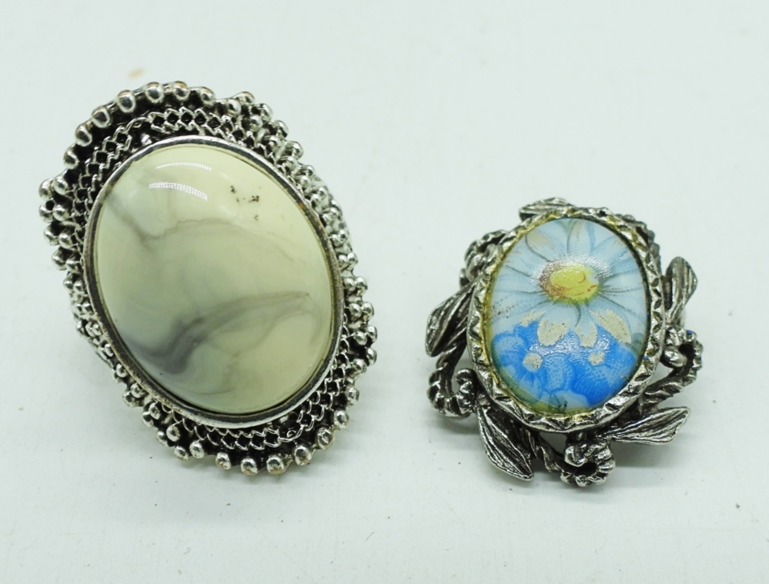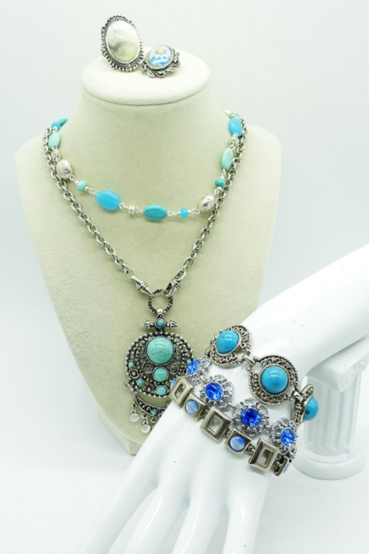 TWO NECKLACES, 20″ & 30″. THREE BRACELETS 7-8″. VTG SMALL BROOCH, RING SIZE 11.