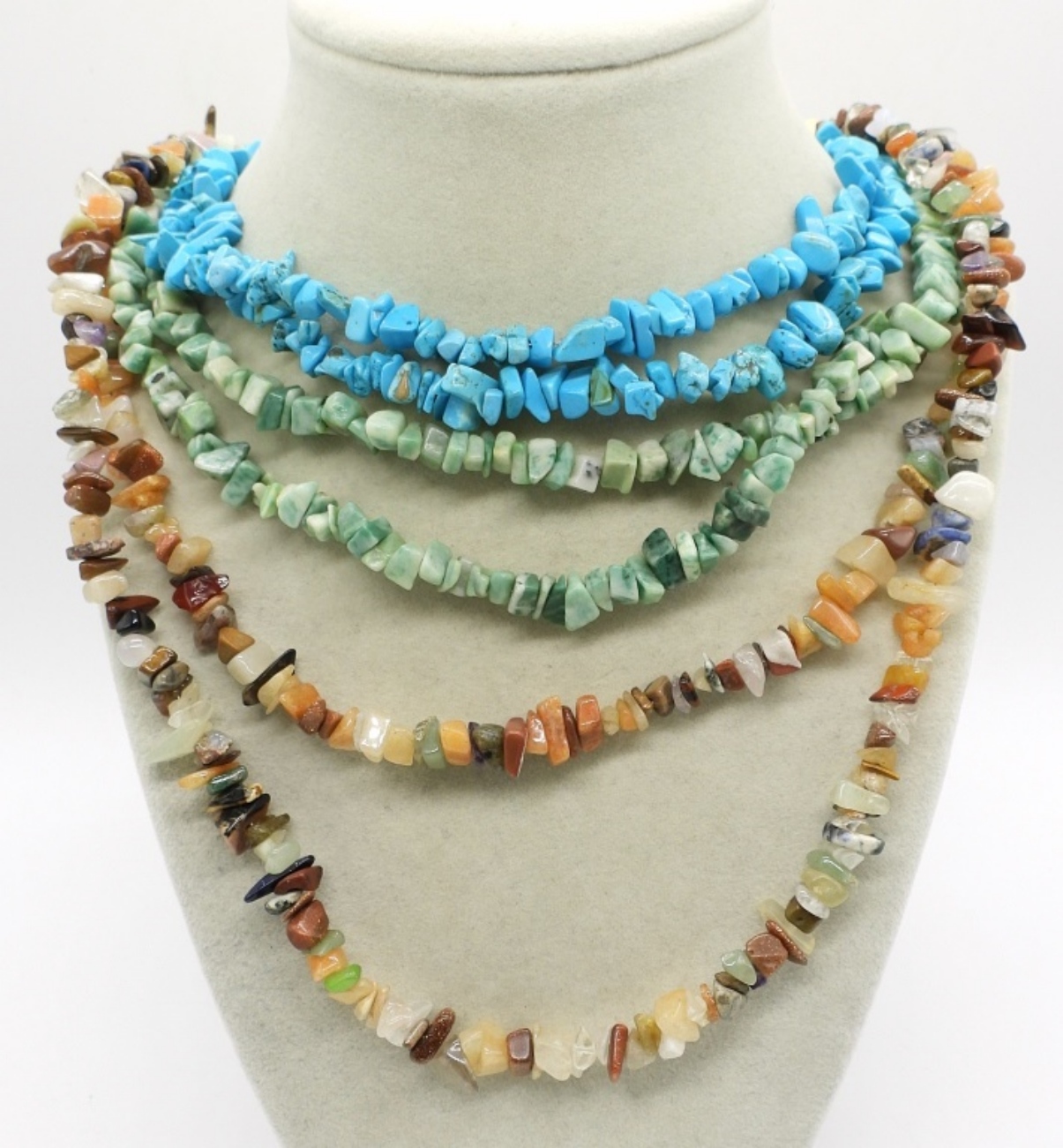 FOUR NATURAL GEMSTONE CHIP NECKLACES, 36″.