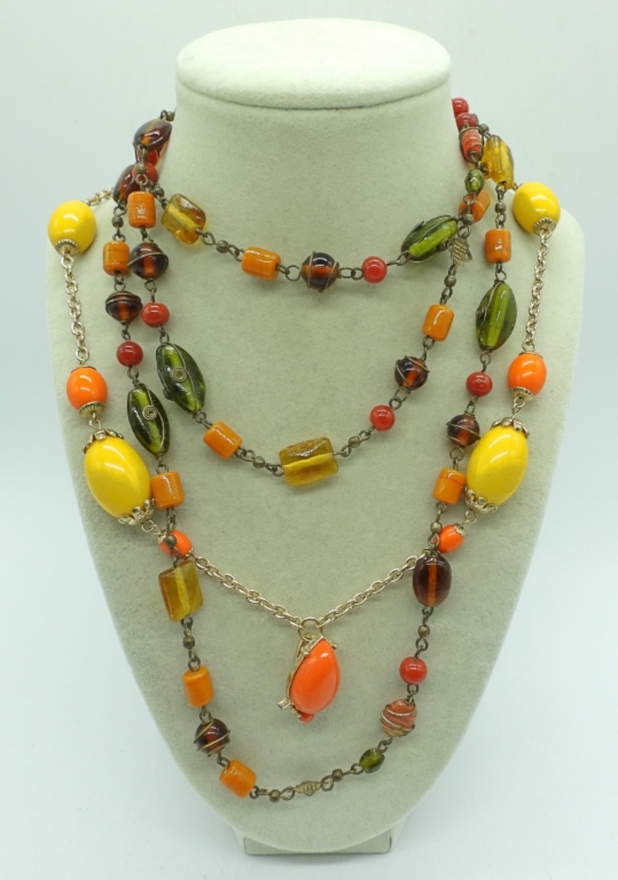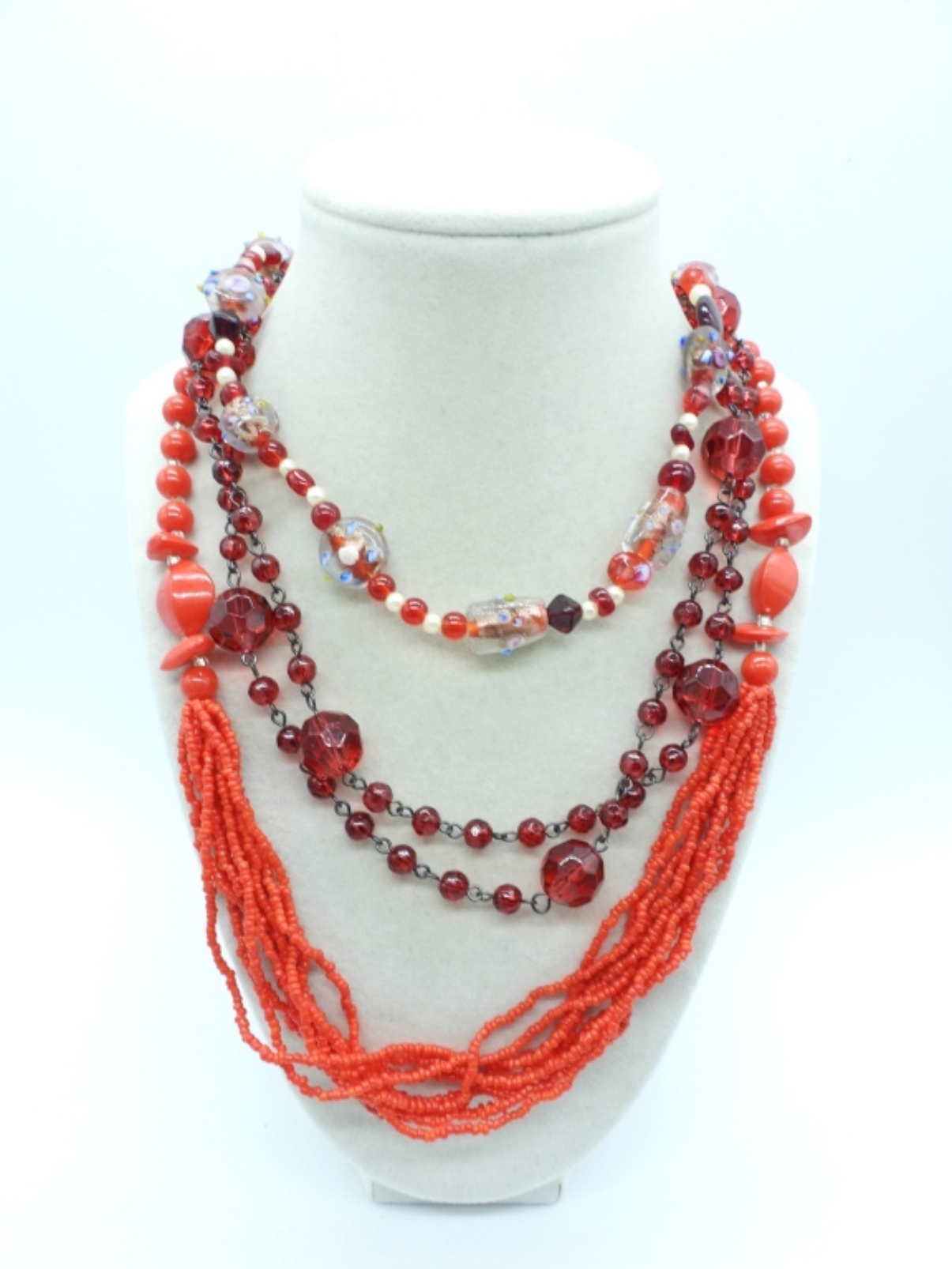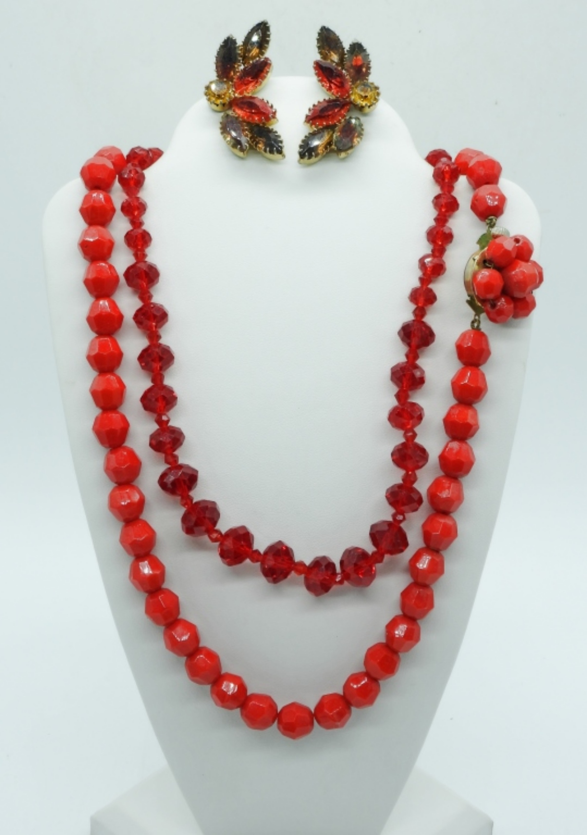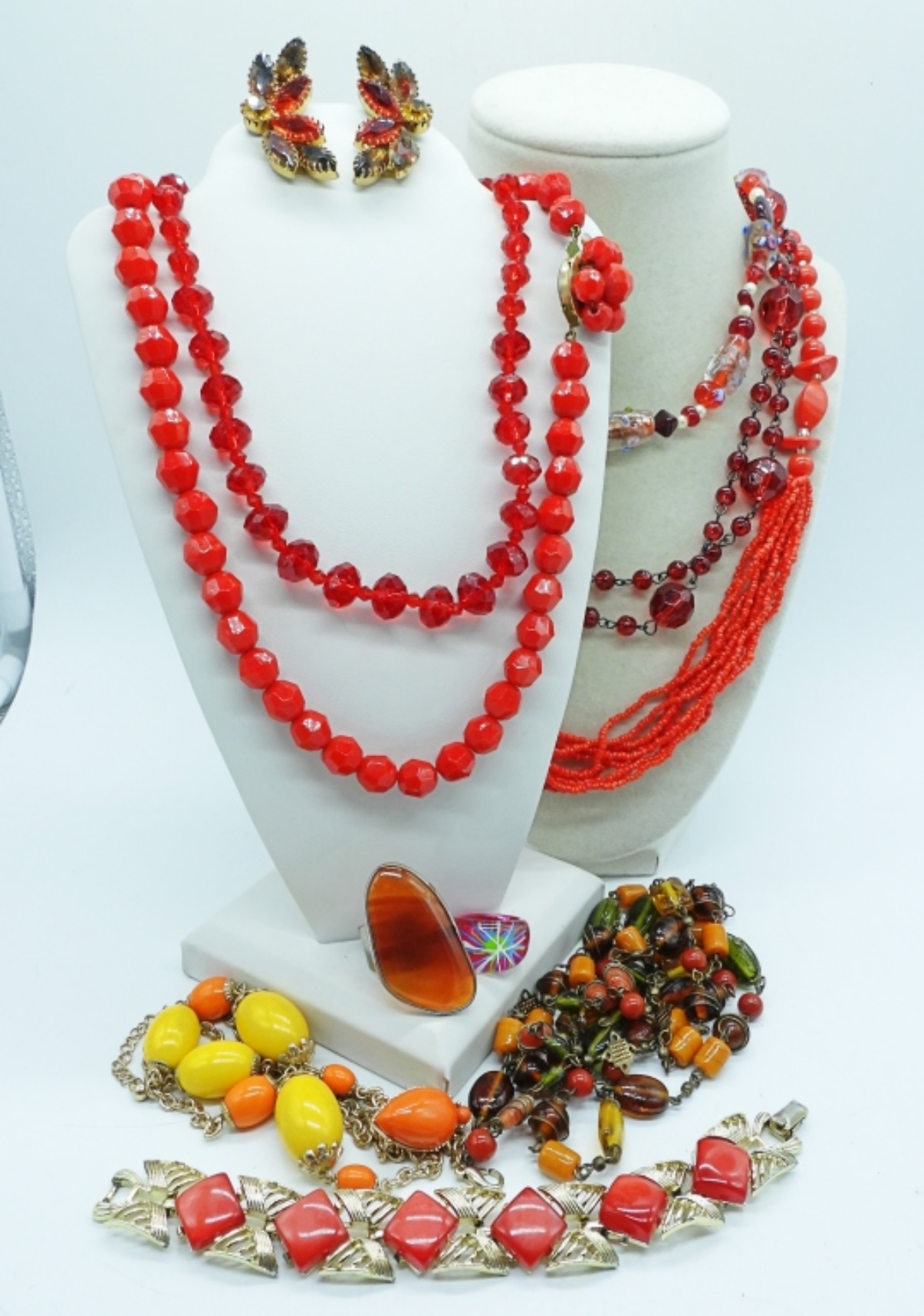 7 NECKLACES, 18-46″. TWO RINGS SIZES 6 & 8. RED RHINESTONE VINTAGE CLIP ON EARRINGS, 2″. CORO BRACELET, 7″.