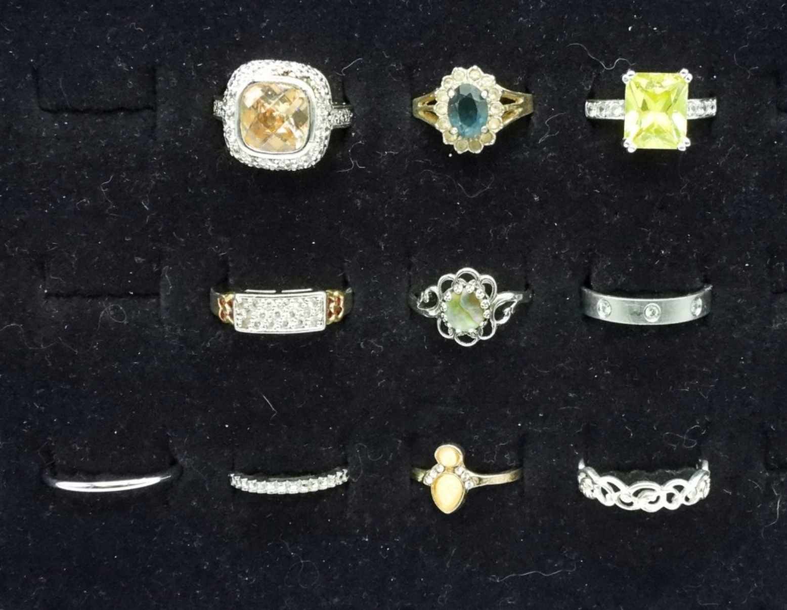 TEN PRETTY GOLD AND SILVER TONE FASHION RINGS, PRETTY GEMSTONES. SIZES 6-10