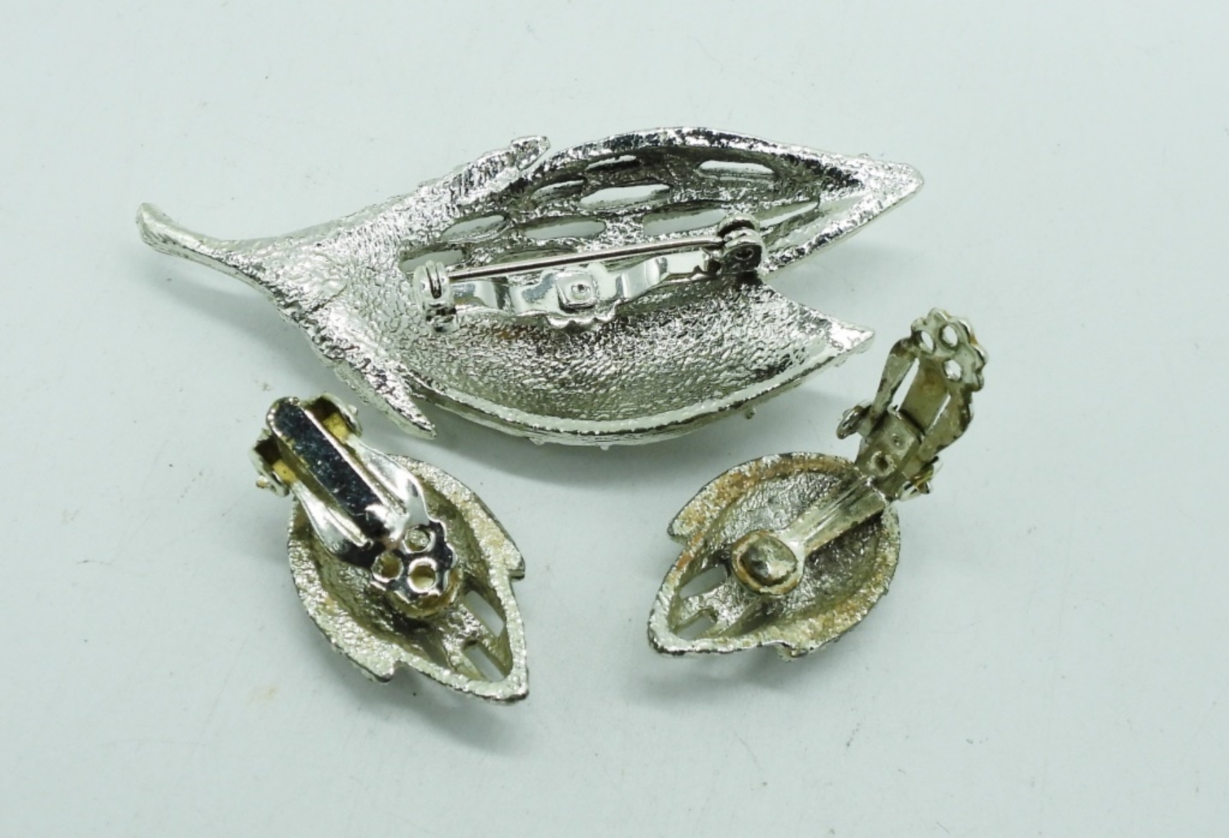 VINTAGE SILVER TONE BROOCH & MATCHING EARRINGS, LOOK LIKE CORN. HAVE A FEW SMALL RHINESTONES. ONE EARRING IS MISSING A RHINESTONE.