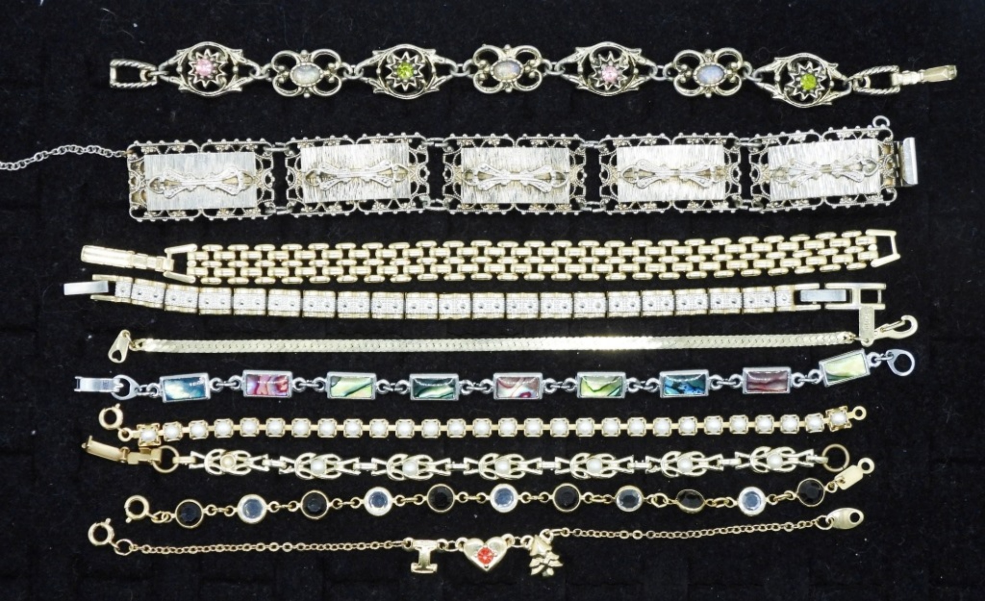 TEN FUN GOLD AND SILVER TONE BRACELETS WITH VARIOUS GEMSTONES. 7-8″