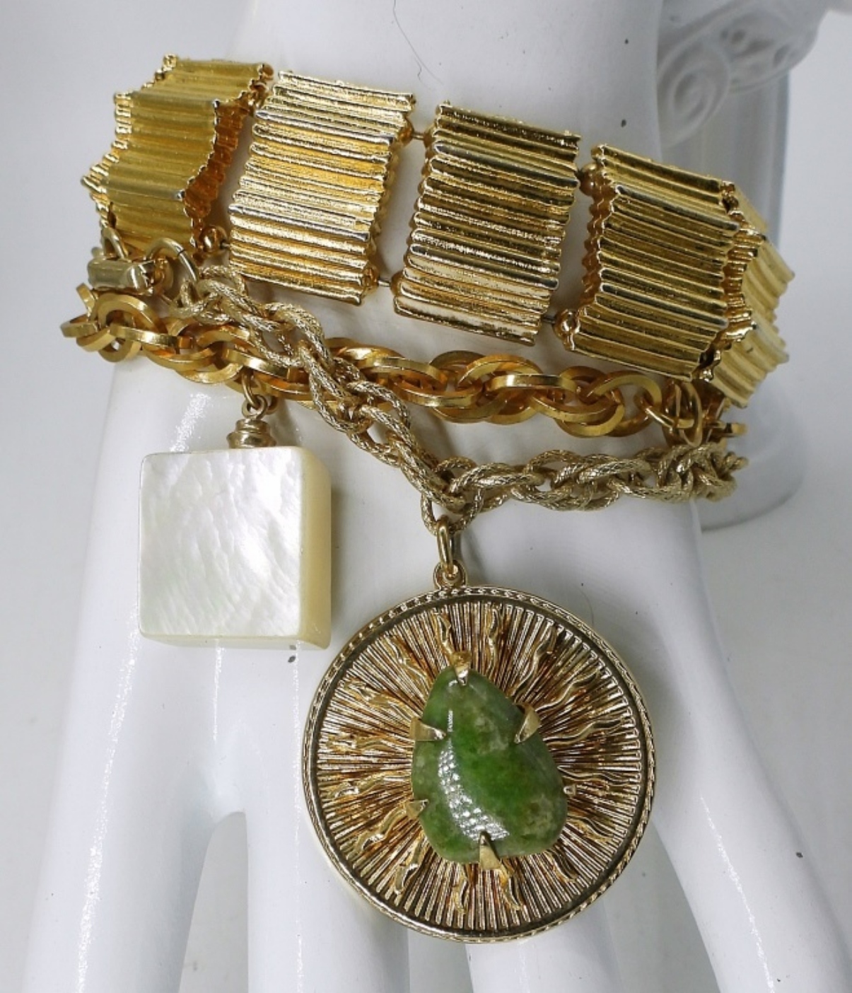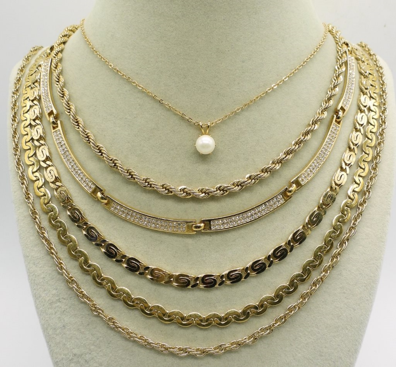 NINE GOLD TONE VINTAGE NECKLACES AND BRACELETS IN GOOD CONDITION! NECKLACES ARE 16″-30″. BRACELETS HAVE GEMSTONES AND MEASURE 7-8″.