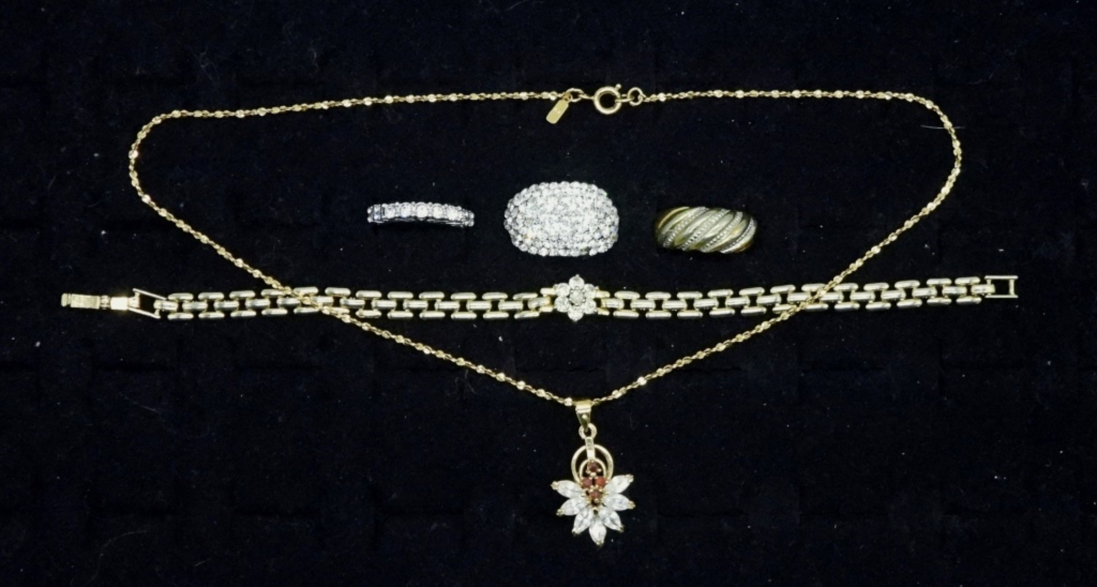 GOLD TONE NECKLACE WITH DIAMOND & RUBY COLORED GEMSTONES, 14″ CHAIN. GOLD TONE BRACELET WITH DIAMOND COLORED GEMSTONES 7″. THREE FASHION RINGS, SIZES 6, 7, 7.5