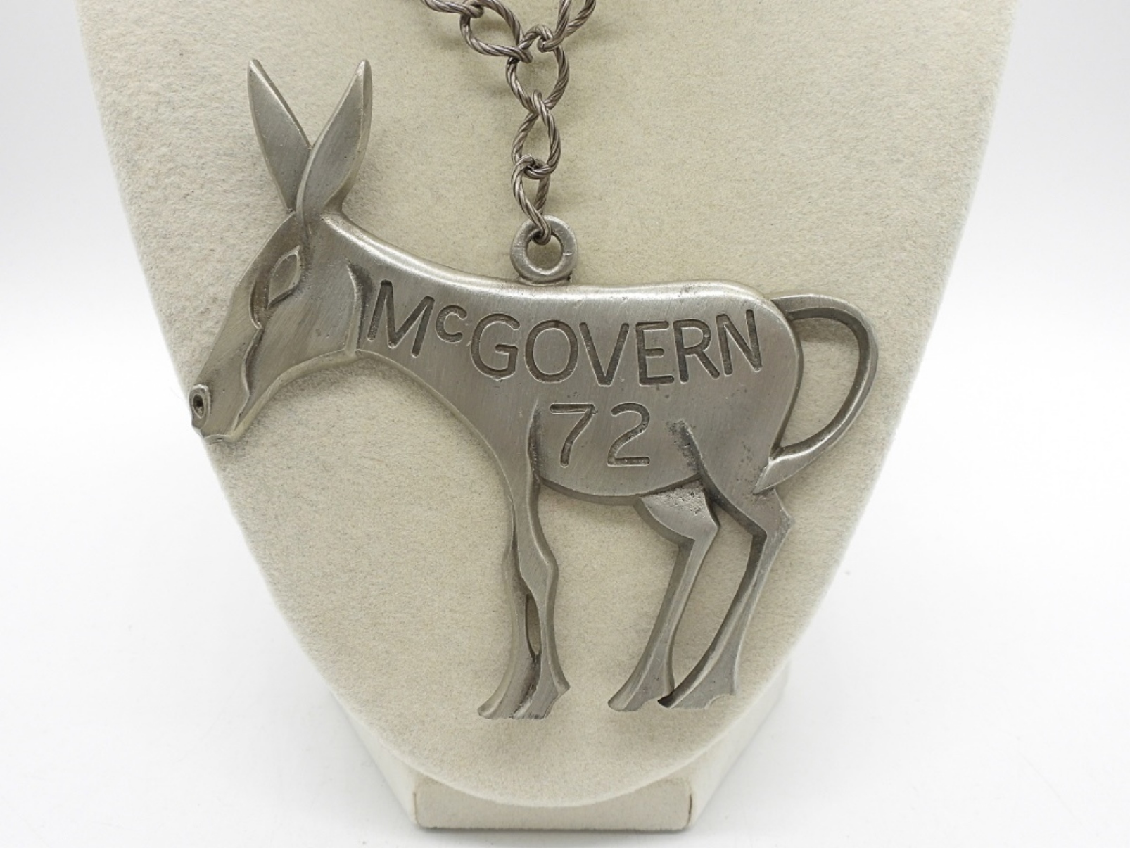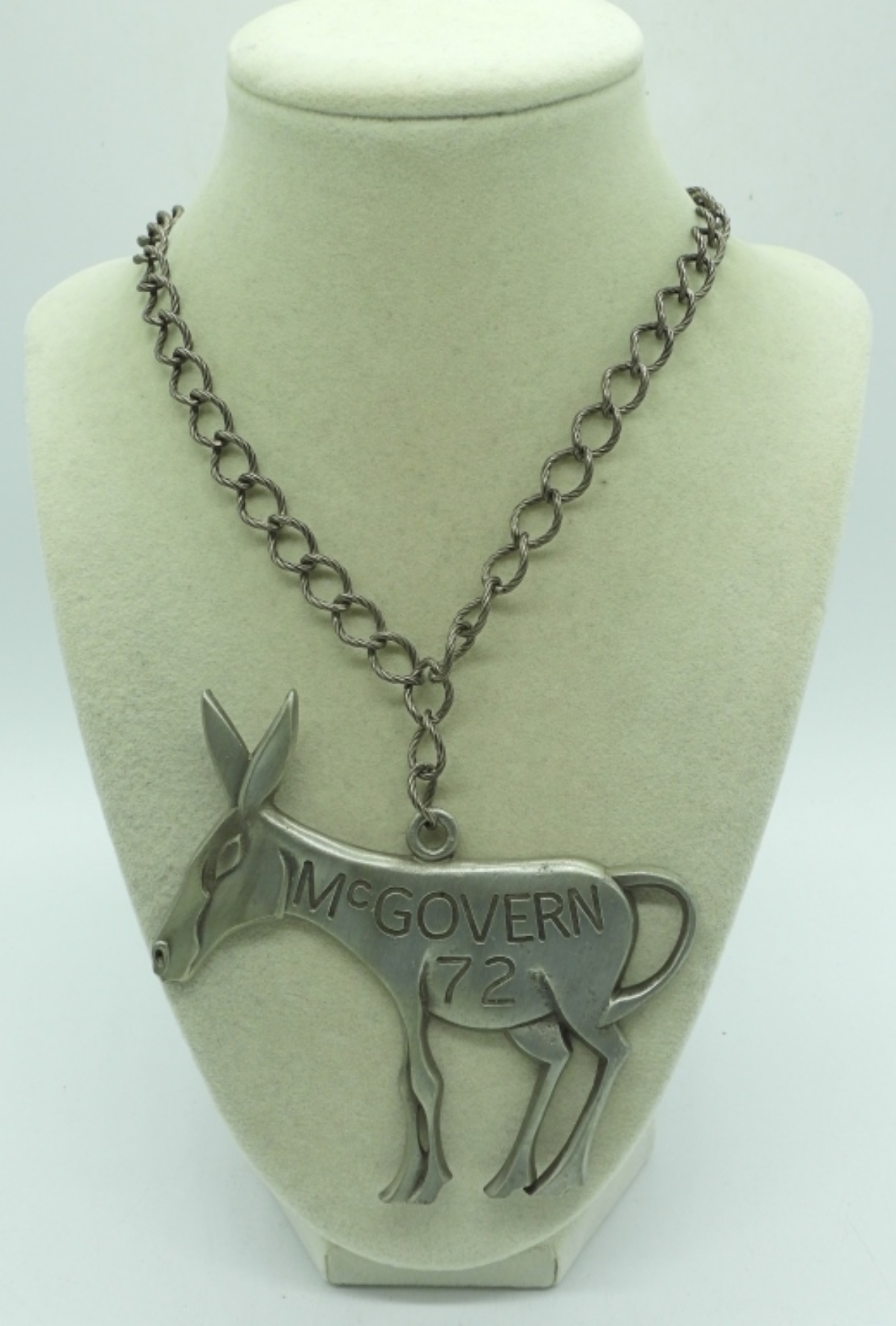 1972 GEORGE MCGOVERN SENATOR FROM SOUTH DAKOTA FROM 1963-1981. CAMPAIGN DONKEY MEDALLION NECKLACE. 26″. DONKEY MEASURES 4″x4″.