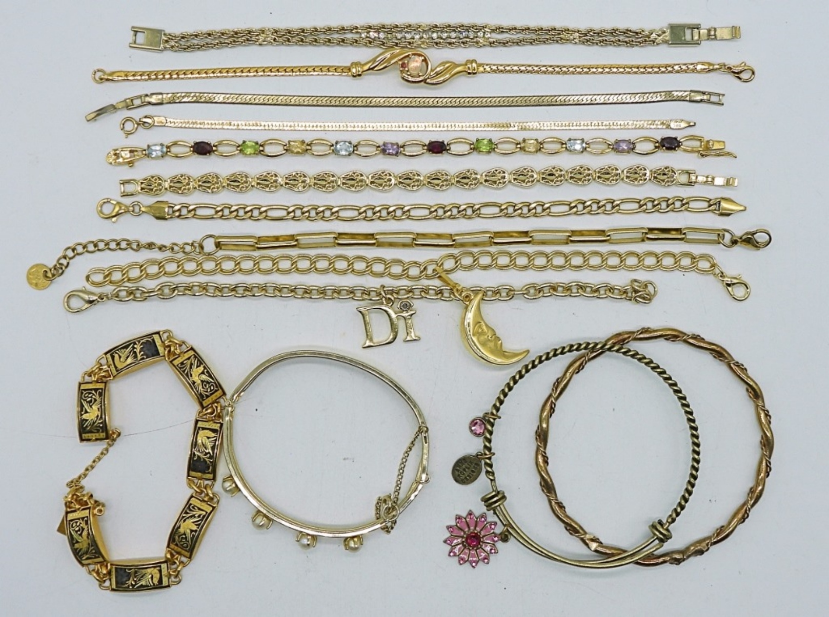 FOURTEEN GOLD TONE BRACELETS, CHAIN STYLE, BANGLE STYLE, GEMSTONES, PEARL & MORE. 7″-8″.