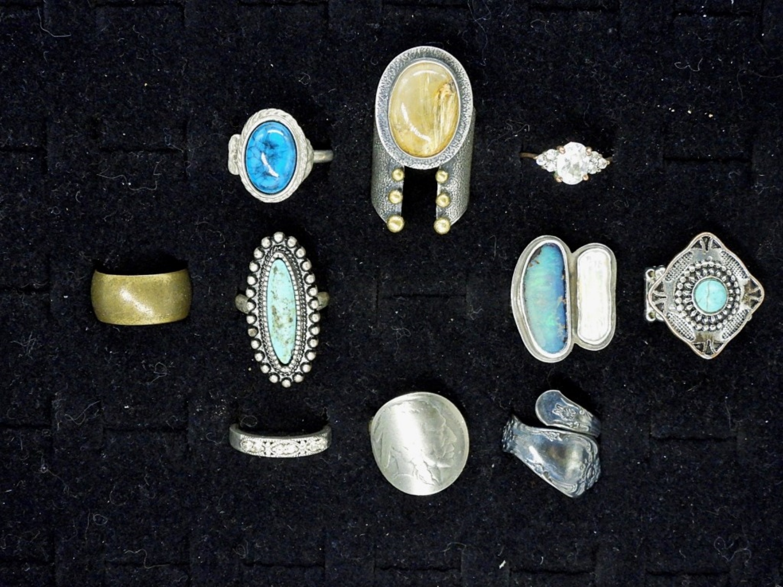 TEN SILVER TONE LADIES FASHION RINGS. SIZES 6-8