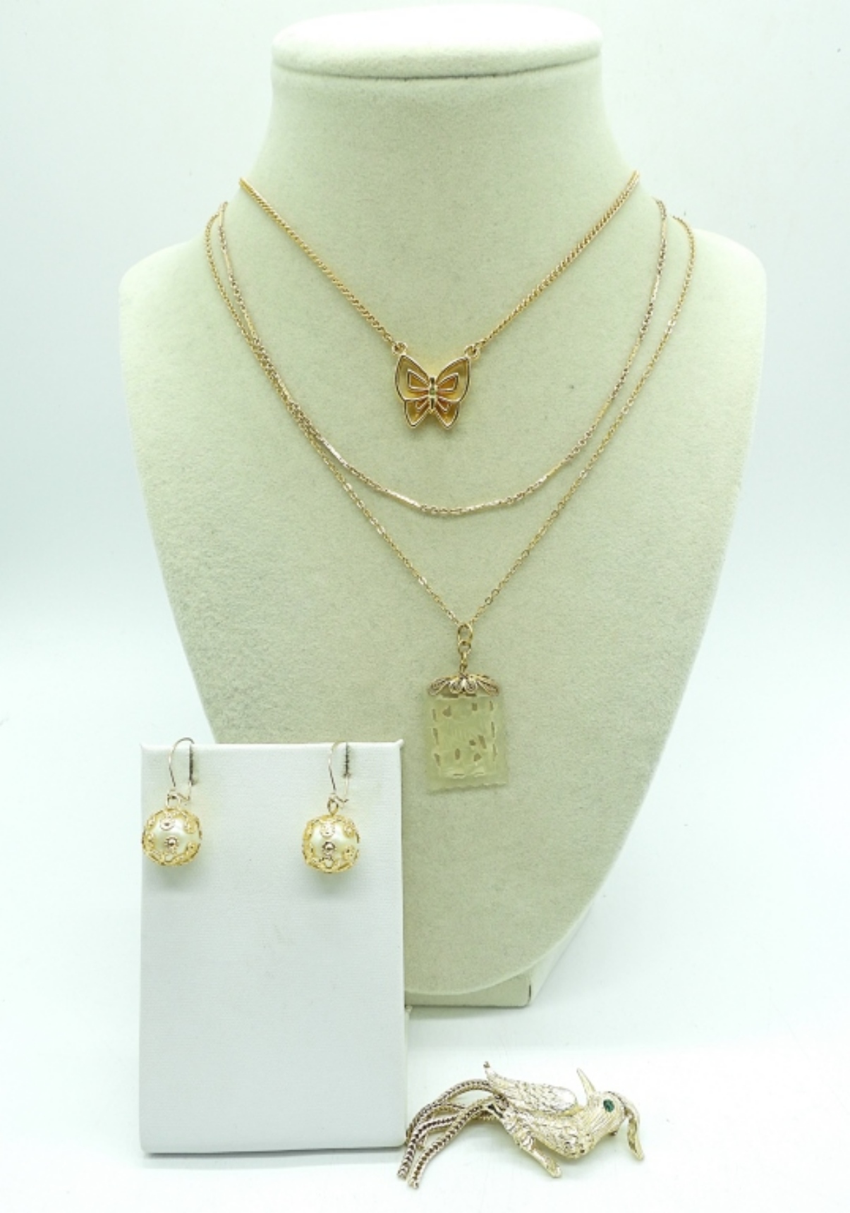 THREE GOLD TONE VINTAGE NECKLACES, 18″. GOLD TONE BIRD BROOCH AND DANGLE EARRINGS.