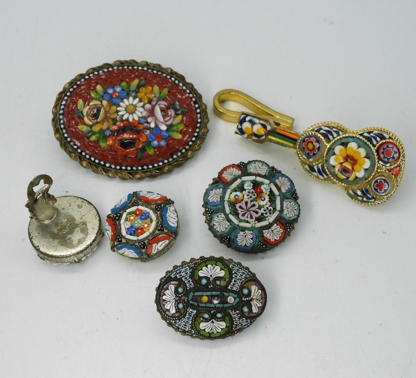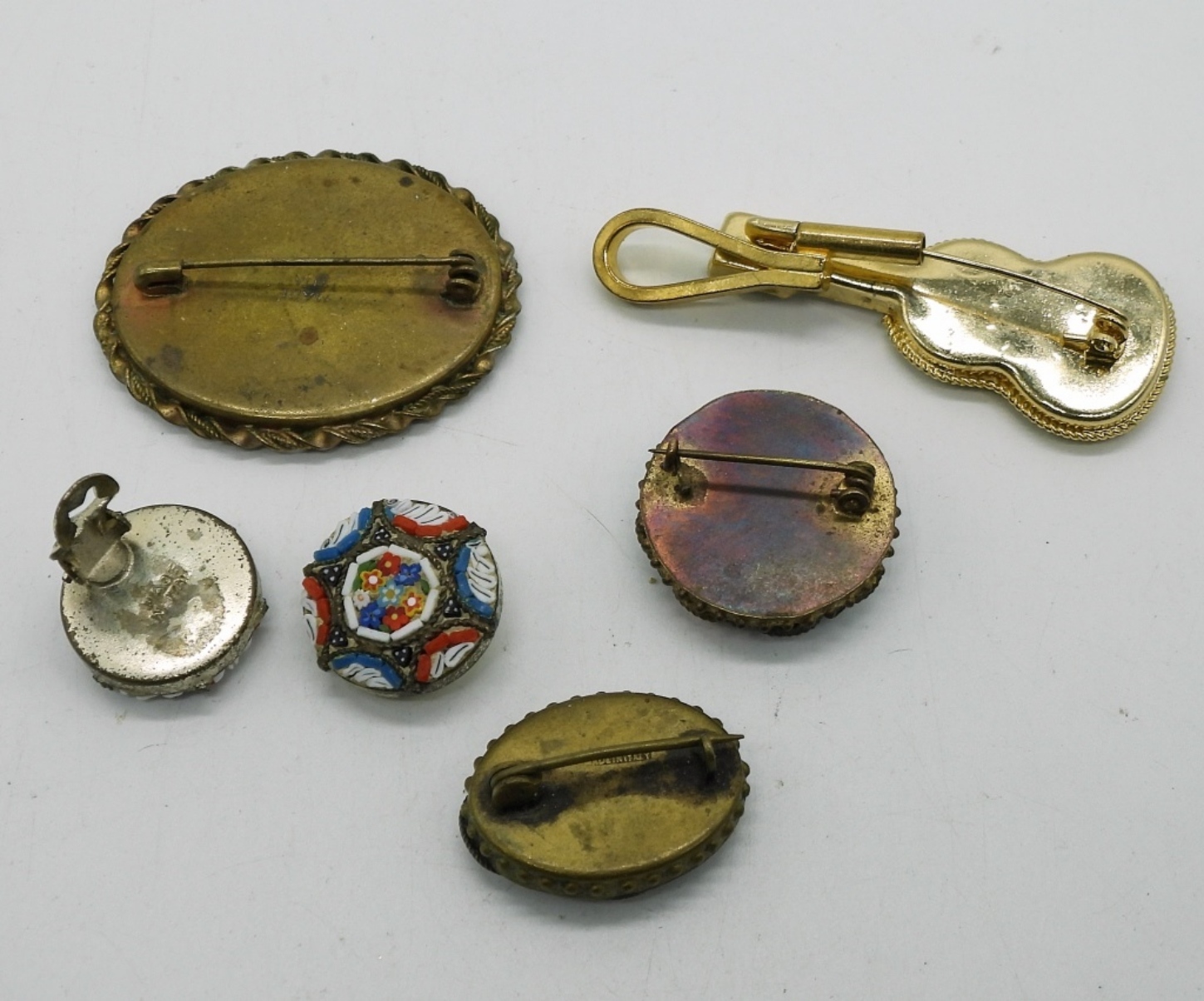 VINTAGE MOSAIC. PIN WITH MATCHING CLIP ON EARRINGS (1″ & 1/2″). OTHER TWO MOSAIC PINS MEASURE 1″ & 1.5″. MOSAIC GUITAR SHAPED BROOCH/PENDANT 2″.