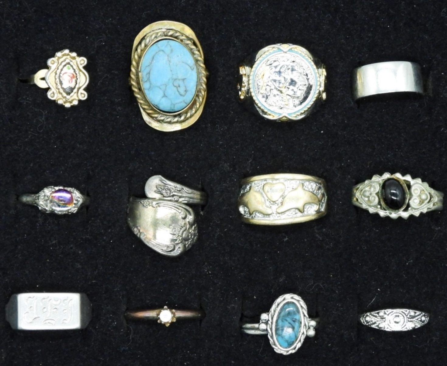 TWELVE GOLD AND SILVER TONE FASHION RINGS. SIZES 4-10