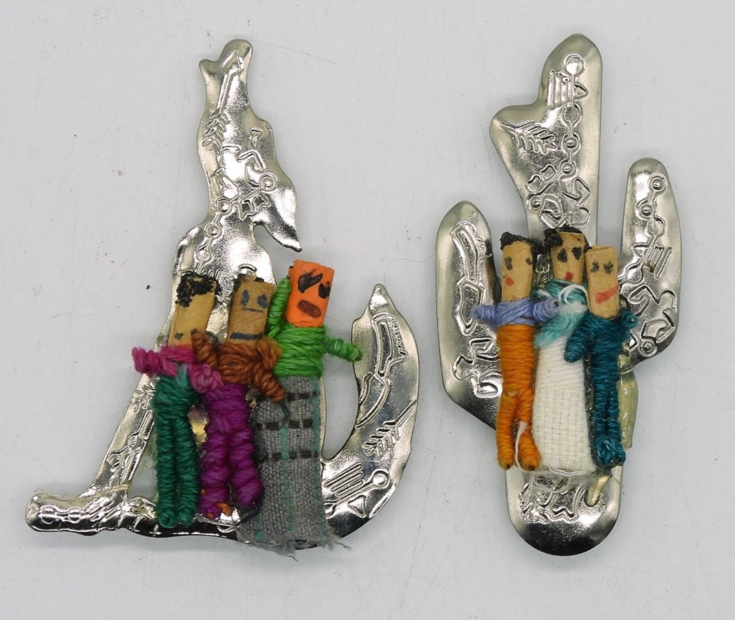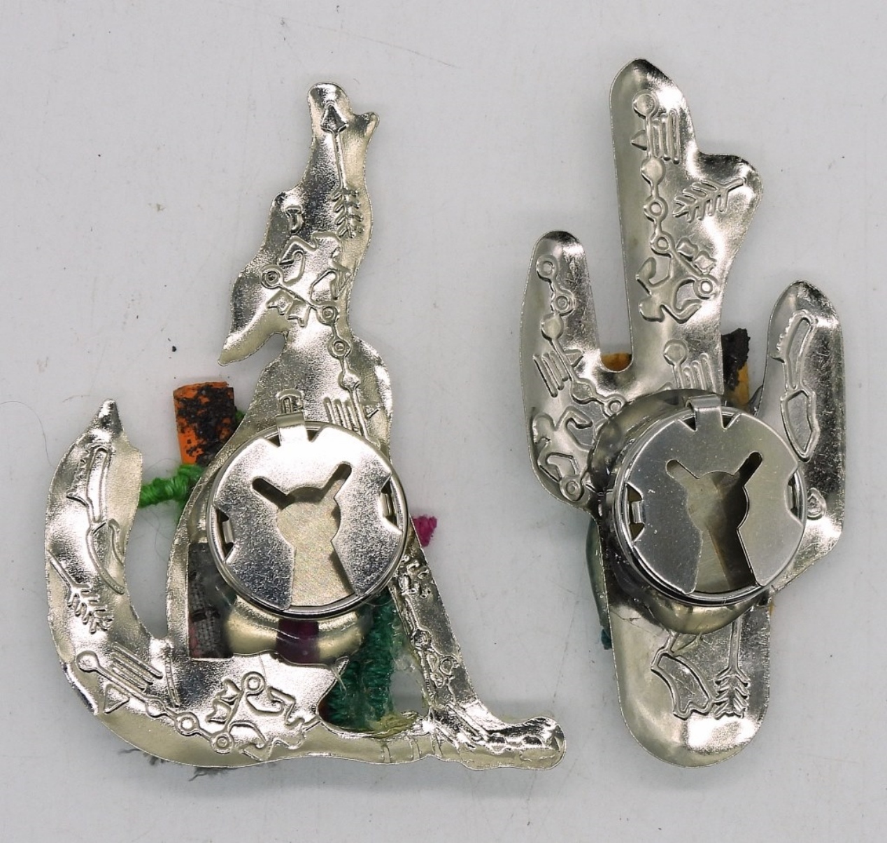 TWO SILVER TONE SOUTHWEST STYLE WORRY DOLL BUTTON COVERS, 2.5″