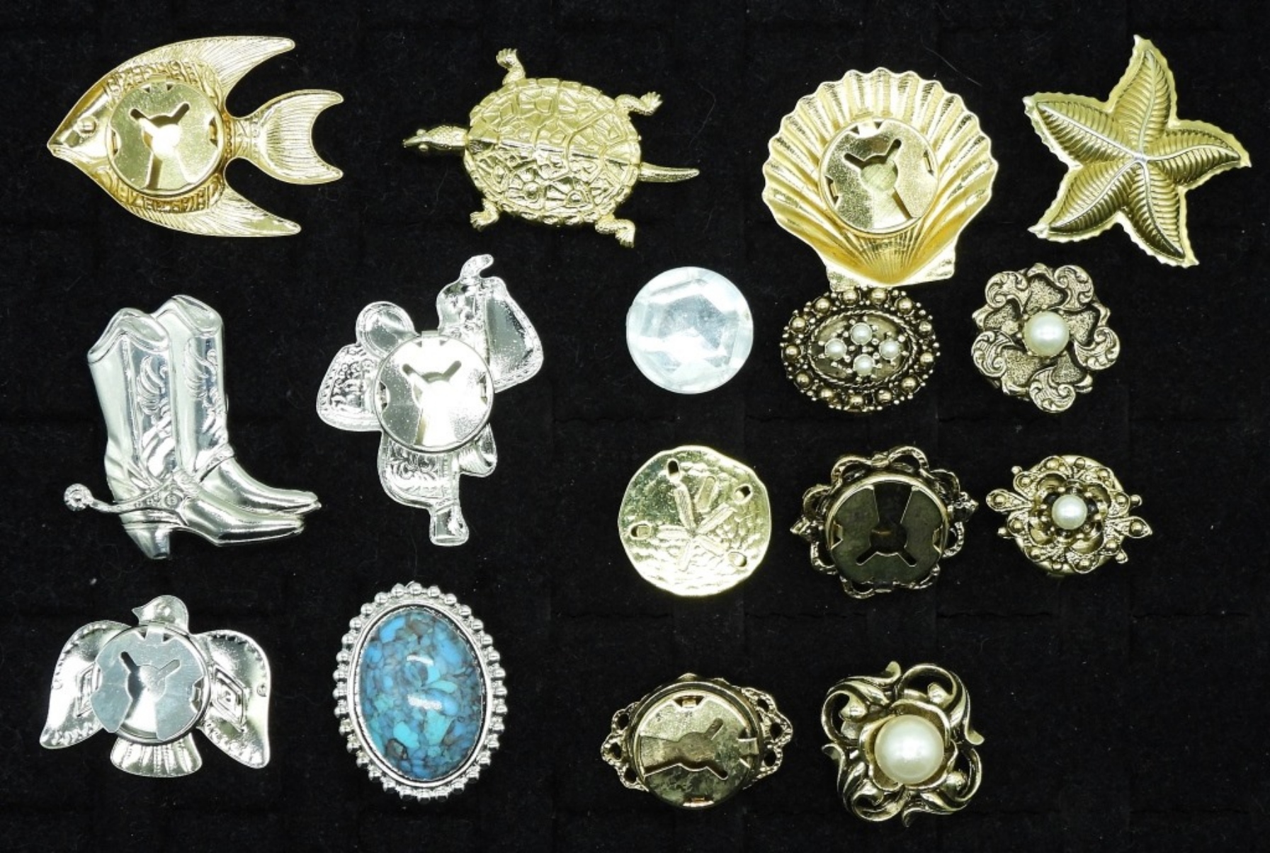 SIXTEEN GOLD AND SILVER TONE BUTTON COVERS, NO TWO ALIKE.