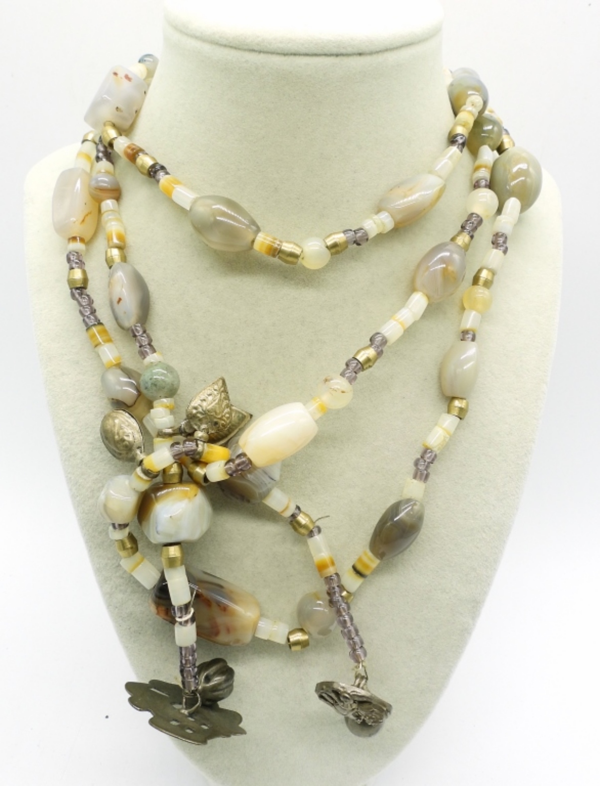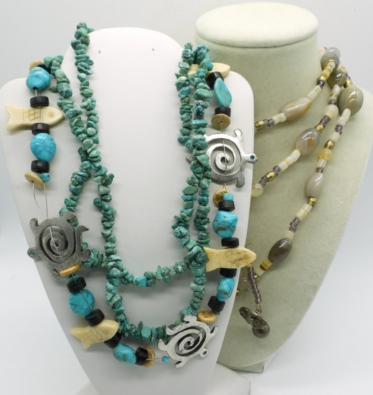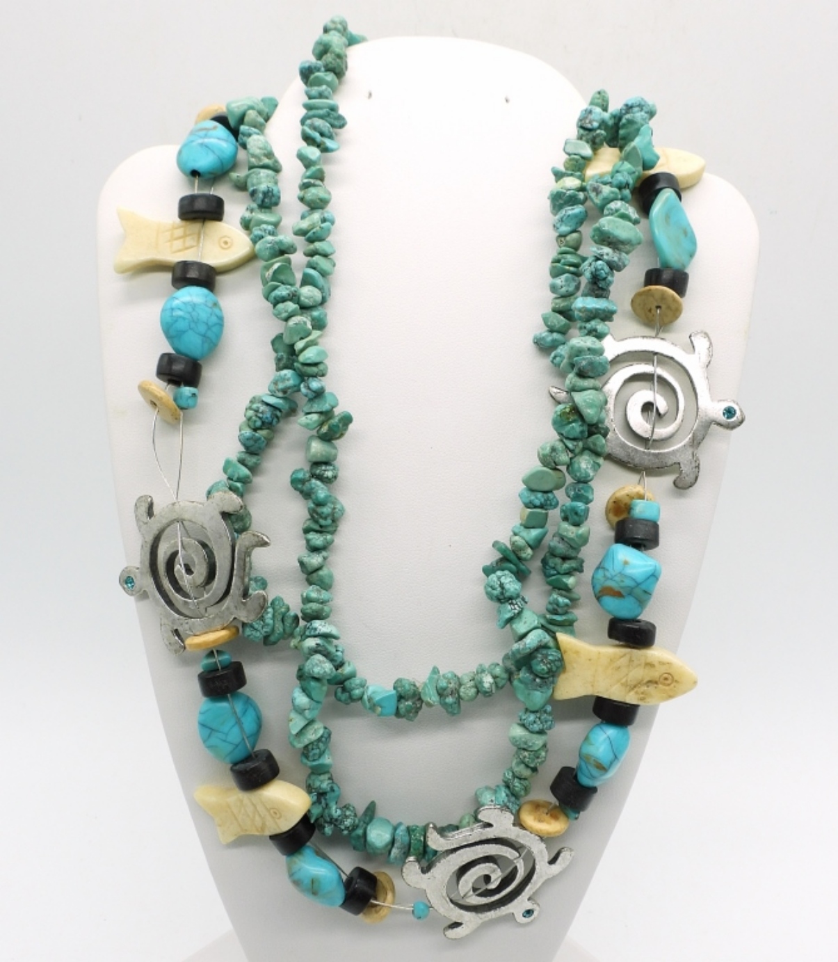 SINGLE STRAND OF CHIP TURQUOISE, 34″. WRAP NECKLACE, 54″ WITH NATURAL AGATE STONES. SOUTHWEST STYLE FISH NECKLACE, 21″.