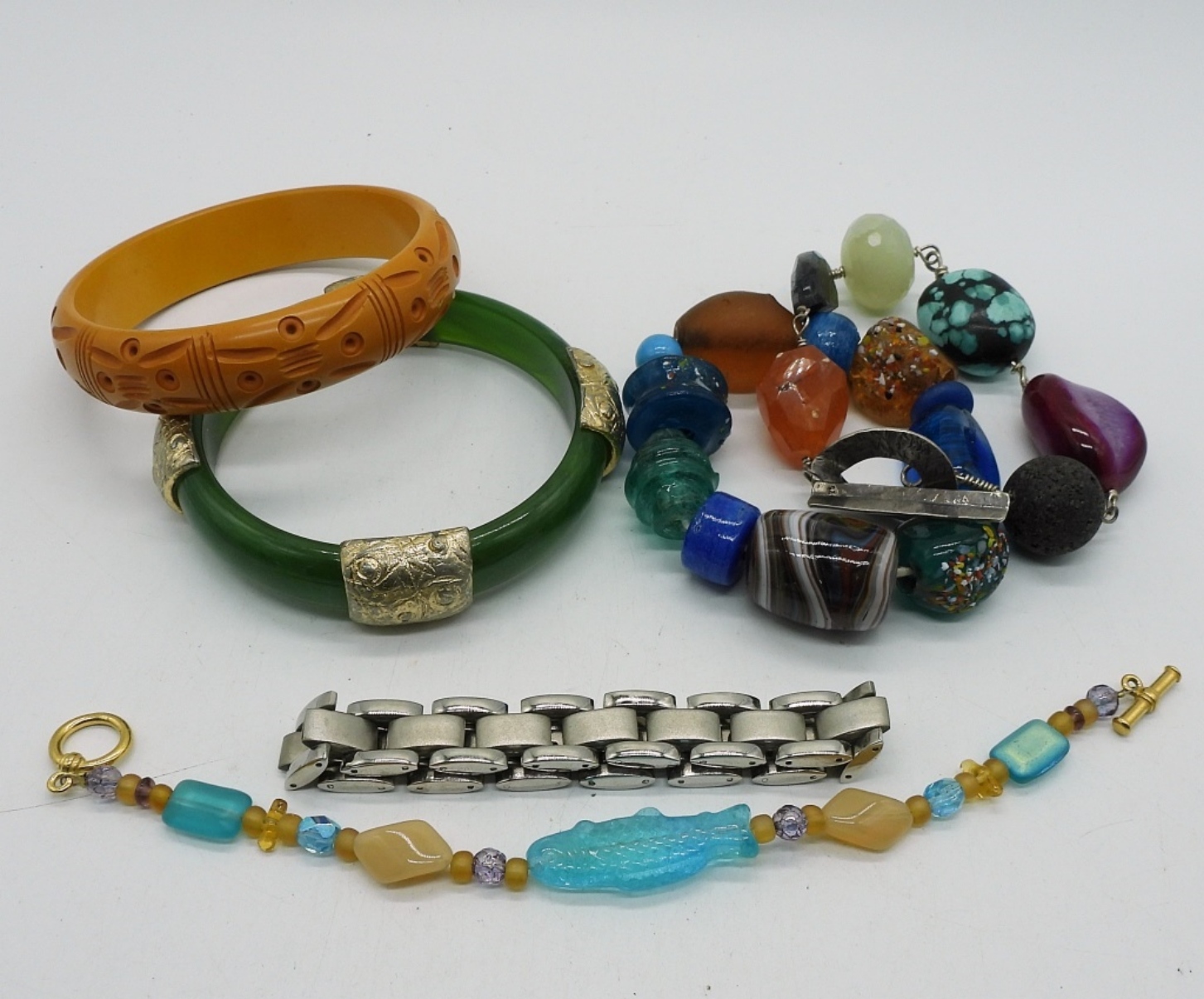 SIX FASHION BRACELETS. LARGE BEADS, CUFFS, LINK & BEADED. 7-8″