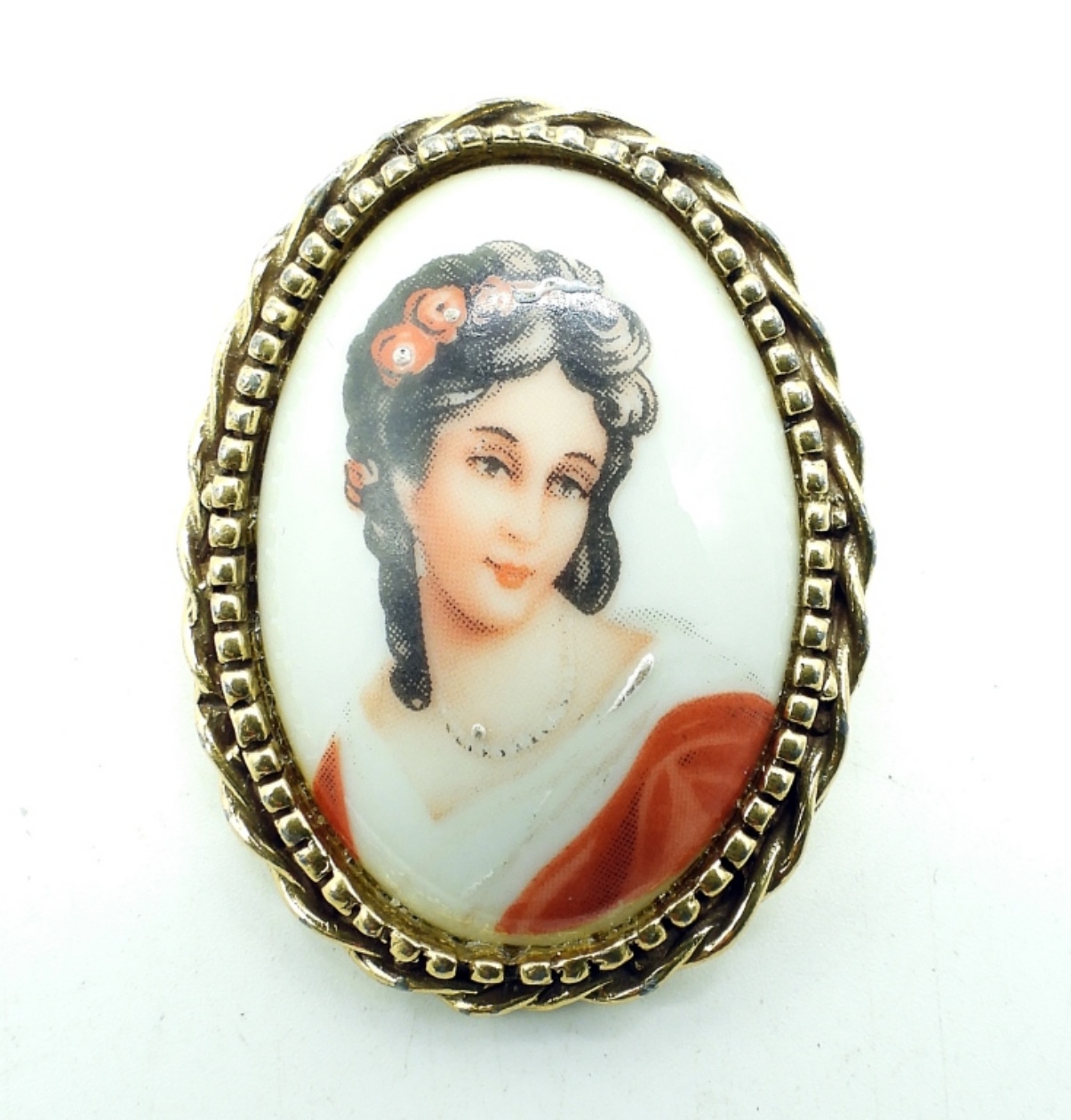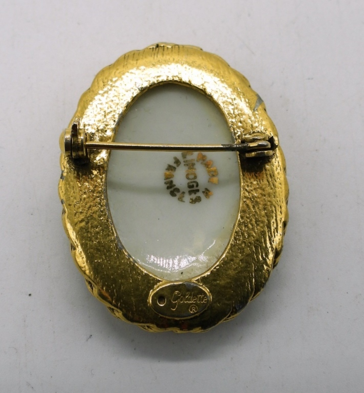 A LIMOGES PORCELAIN BROOCH IN A GOLDETTE SETTING. IN GREAT CONDITION! CIRCA 1960s. 1.5″