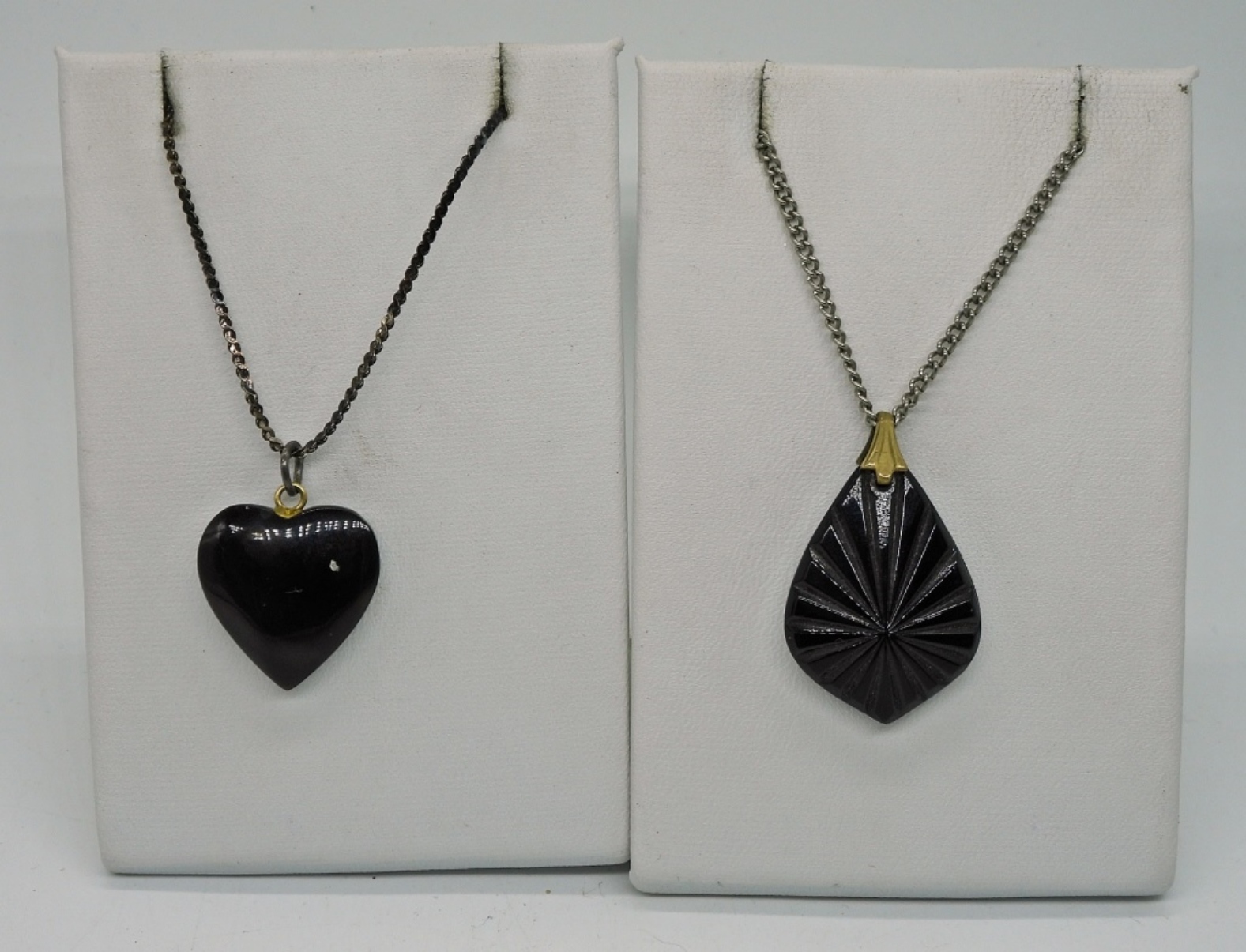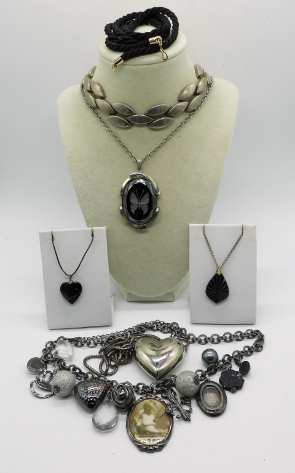 SEVEN SILVER AND BLACK TONE NECKLACES. VERY GOTHY LOOK. 15″-34″