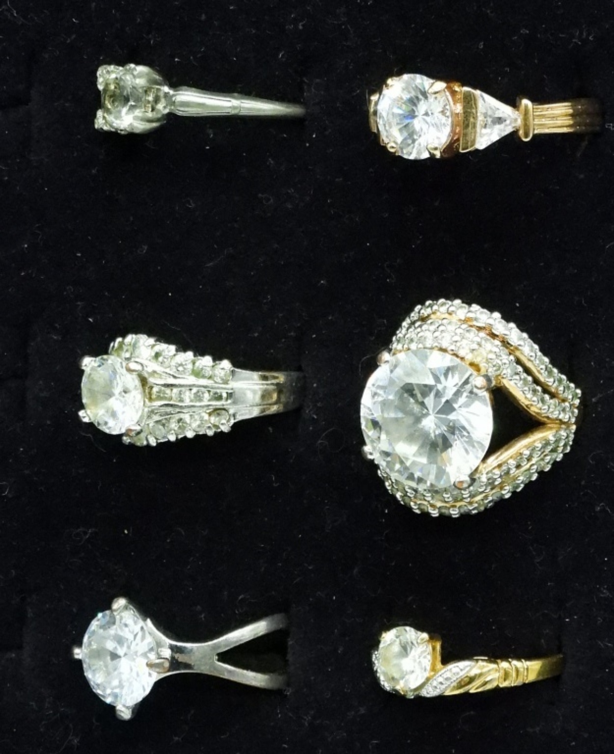 SIX GOLD AND SILVER TONE BRIDAL STYLE COSTUME RINGS. SIZES 5, 7, 8, 10