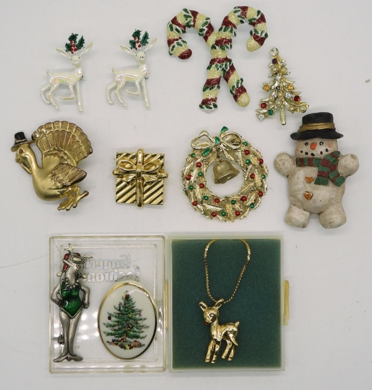 GOLD TONE RUDOLPH NECKLACE, 16″. TEN VINTAGE BROOCHES, CANDY CANES, SNOWMAN, REINDEER, TREES, TURKEY, WREATH & PRESENT.