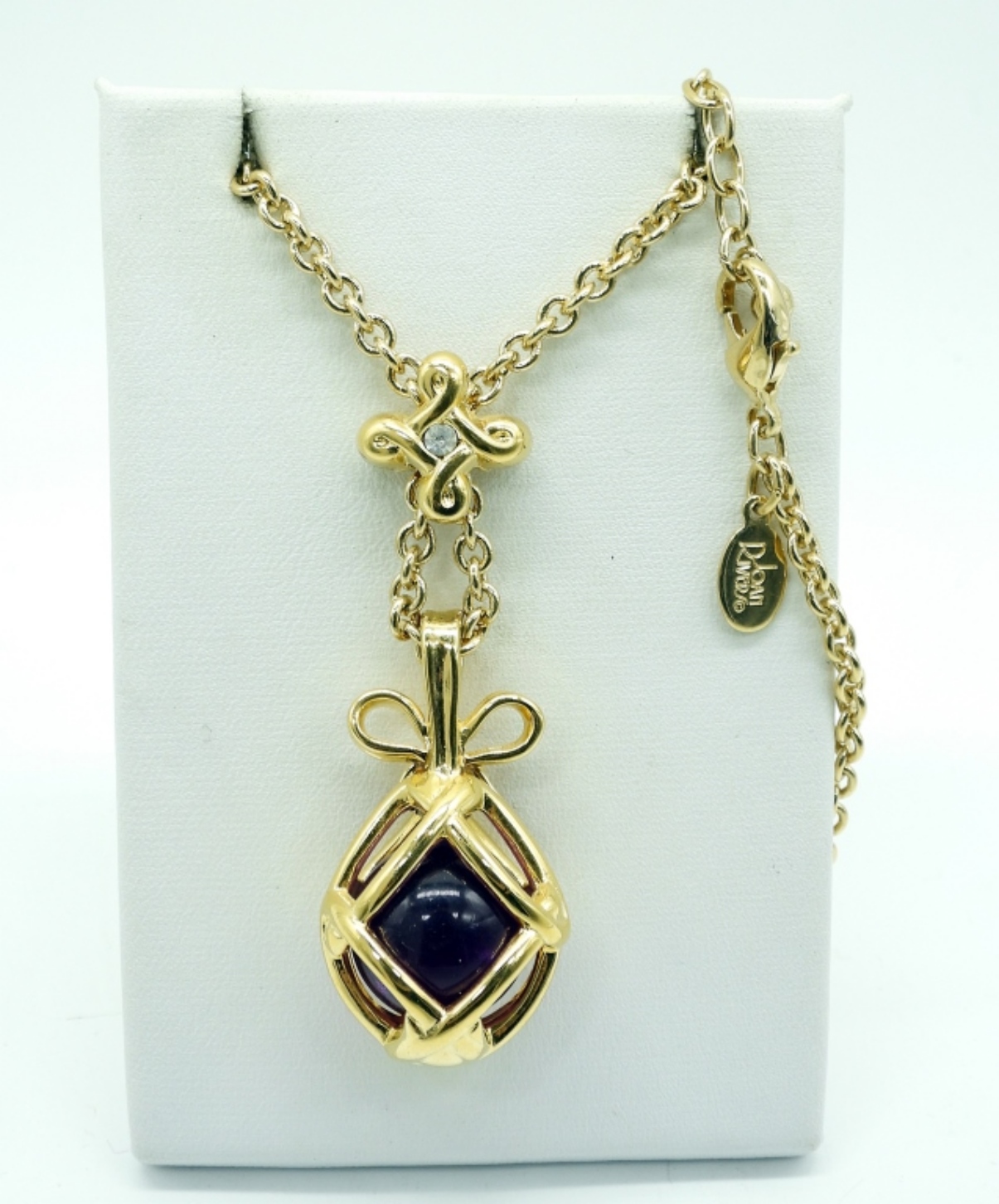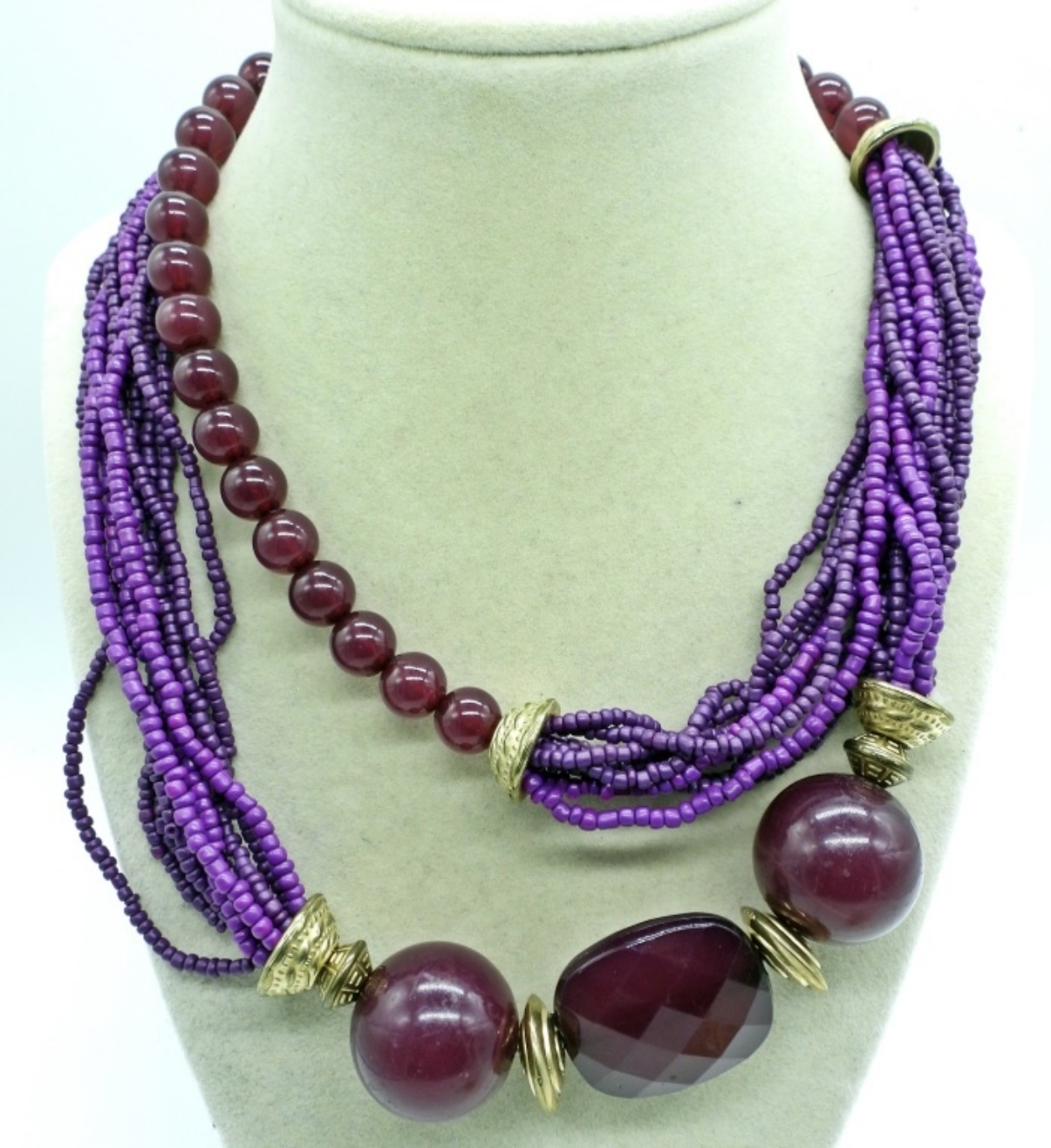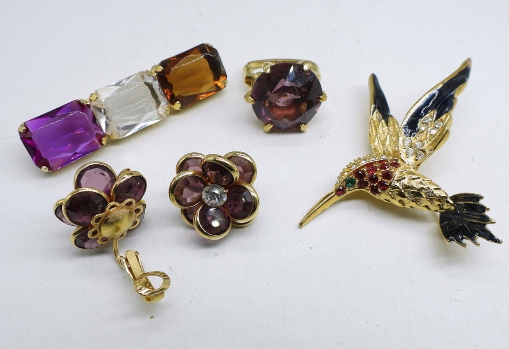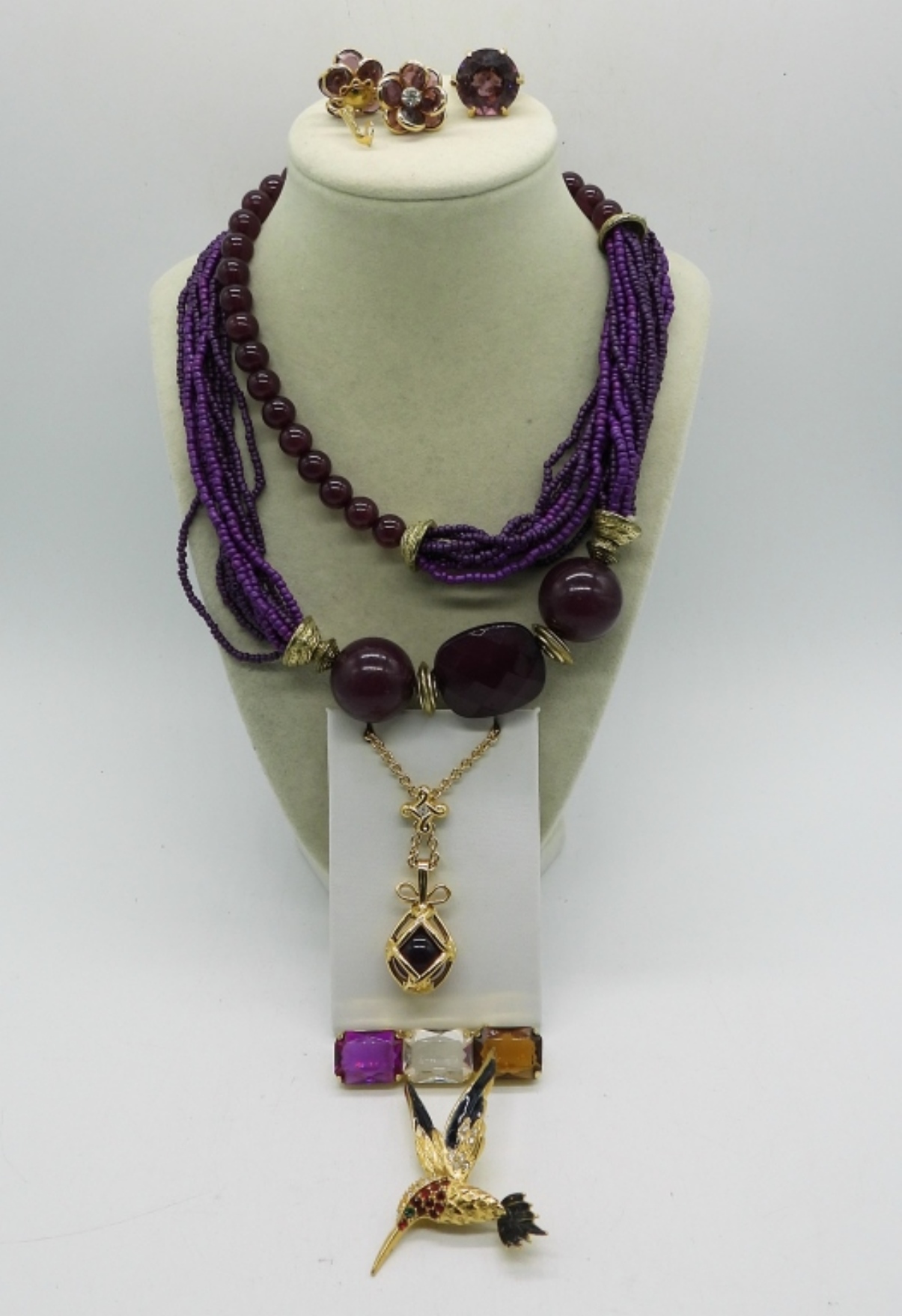 GOLD TONE JOAN RIVERS NECKLACE WITH PURPLE GLASS ORB, 26″. VINTAGE PURPLE BEADED COSTUME NECKLACE, 34″. ONE PAIR CLIP ON EARRINGS, TWO BROOCHES. ADORABLE GIANT PURPLE GEMSTONE ADJUSTABLE RING, 7-8.