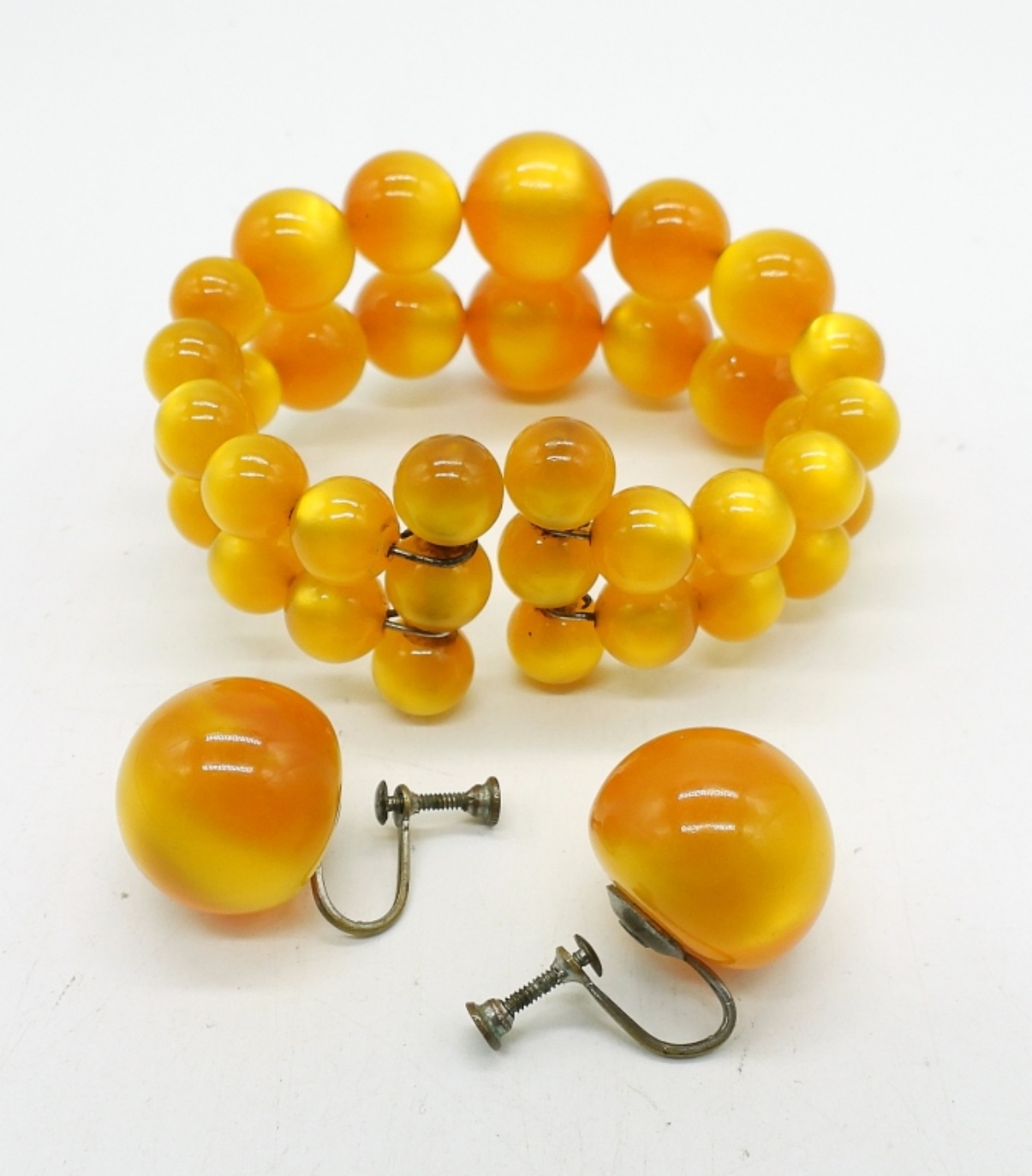 VINTAGE 1940s ORANGE ACRYLIC GRADUATED BEAD CUFF BRACELET WITH MATCHING SCREW BACK EARRINGS. VINTAGE ORANGE AND WHITE BEADED NECKLACE, 21″.