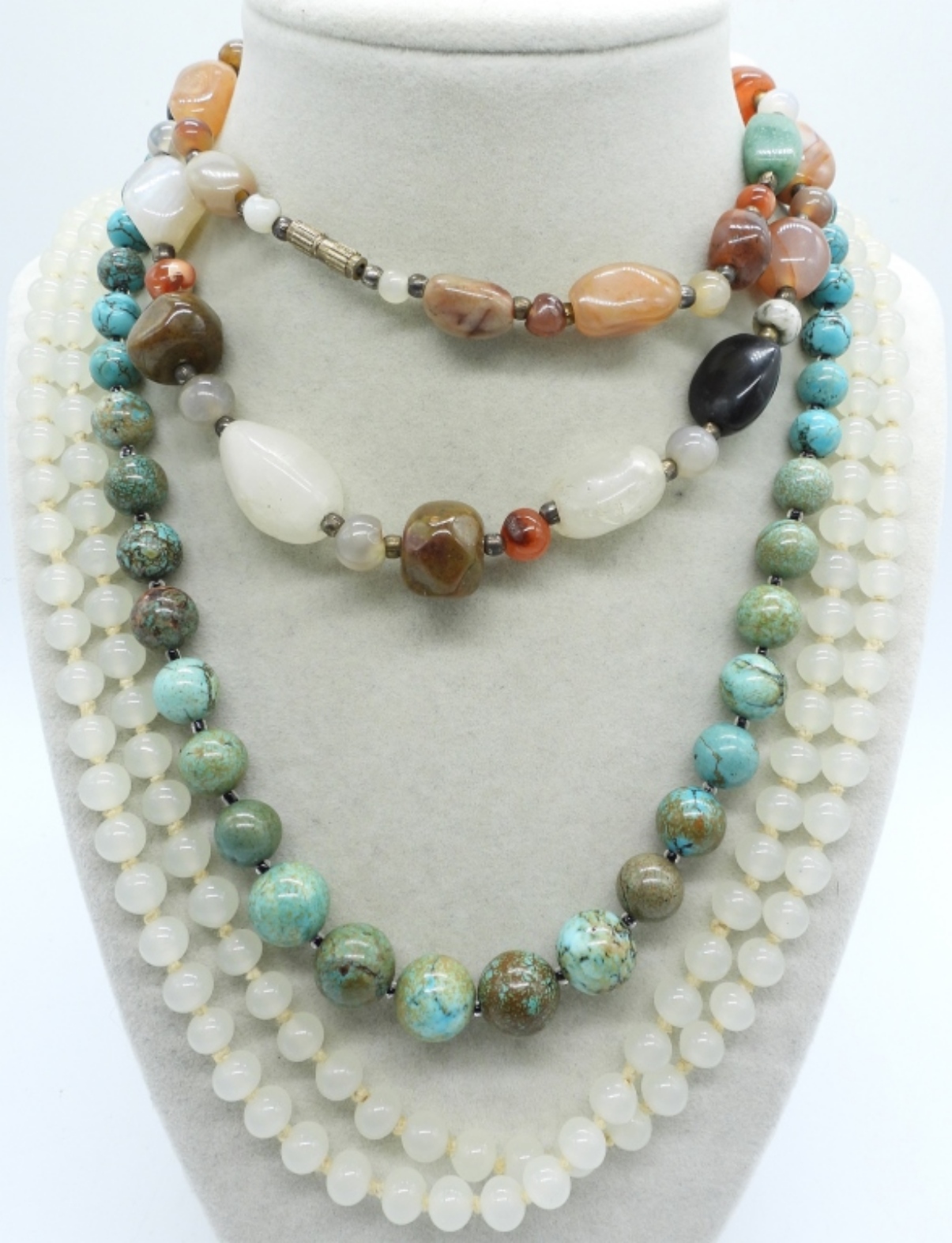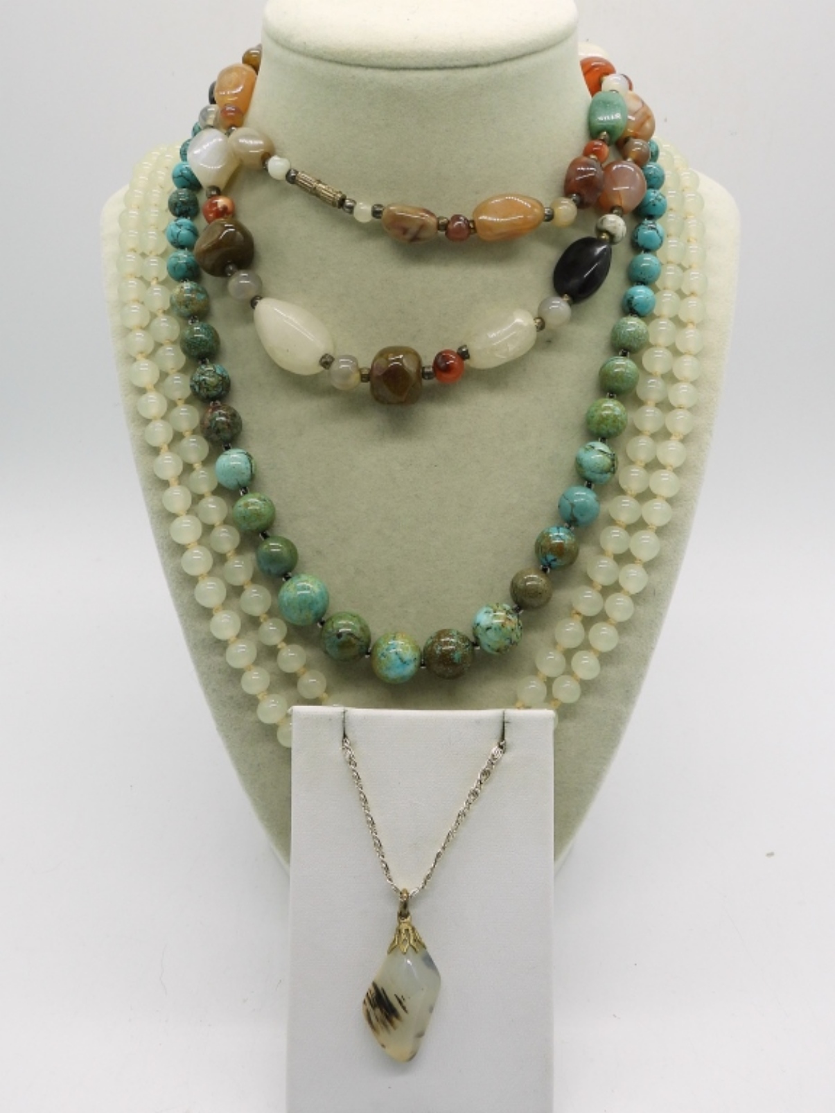 FOUR NATURAL GEMSTONE NECKLACES. VINTAGE AND MODERN. 16″, 18″, 24″, 58″.