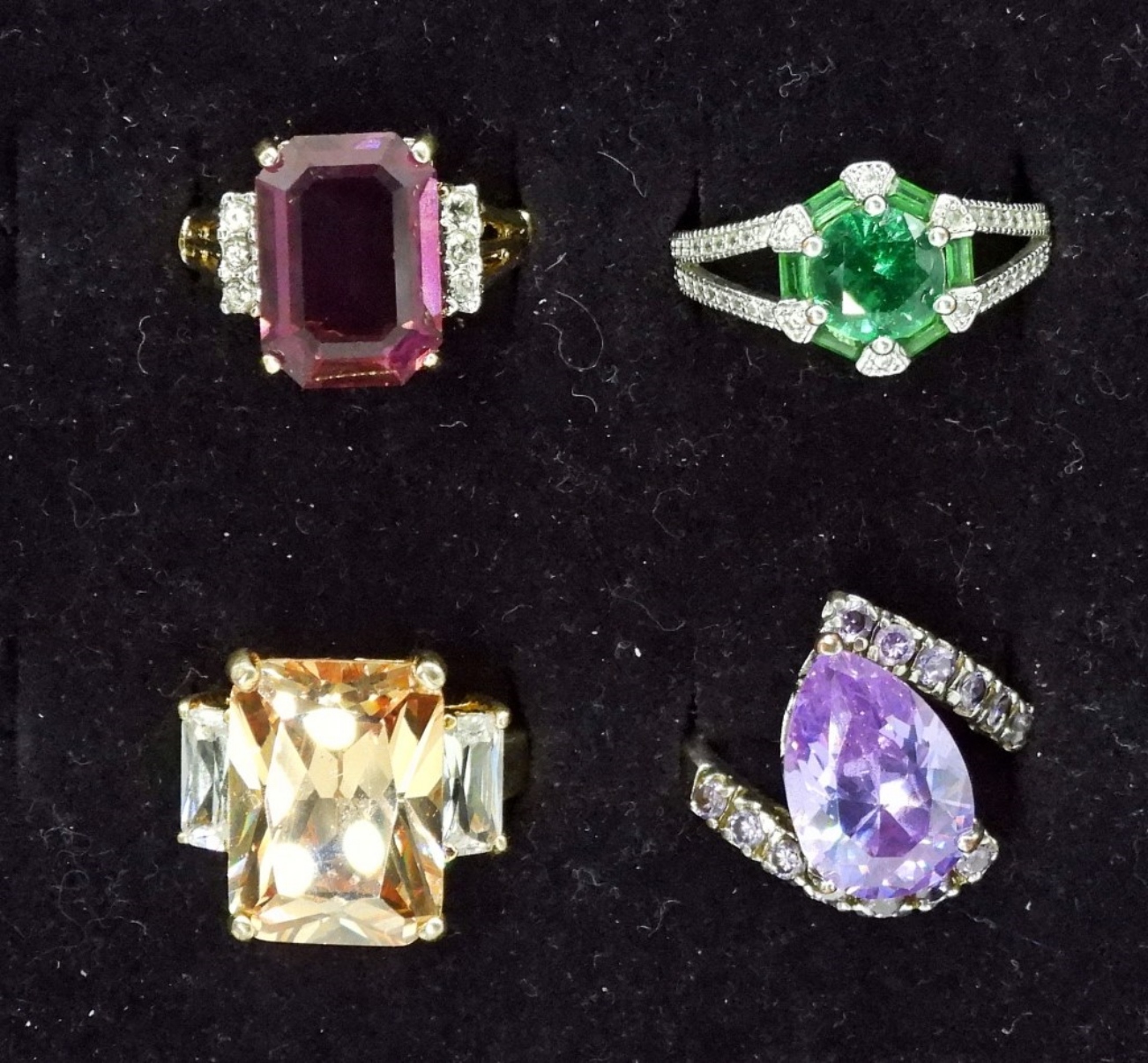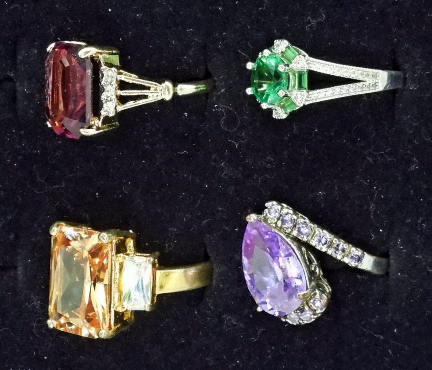 FOUR SILVER AND GOLD TONE LADIES FASHION RINGS, PRETTY GEMSTONES. SIZES 7 & 8