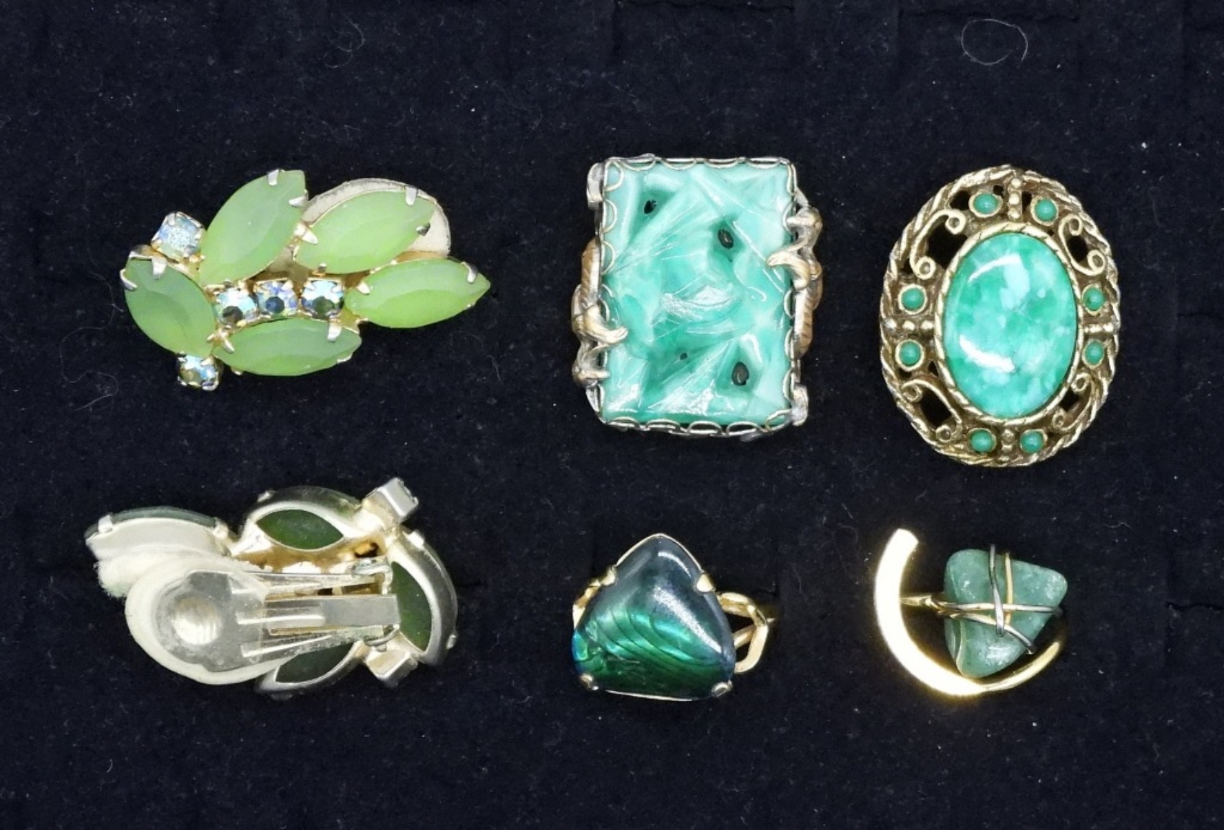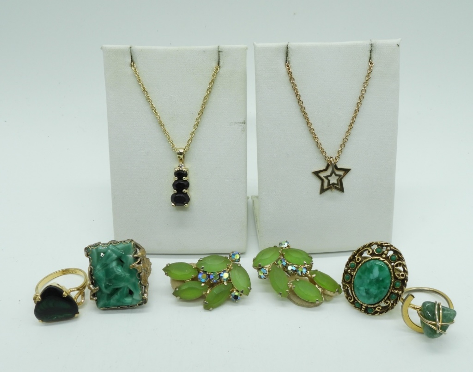 4 GOLD TONE RINGS WITH VARIOUS TYPES OF GREEN GEMSTONES. SIZES 6, 7, 8, 9. GORGEOUS VINTAGE MATTE GREEN RHINESTONE CLIP ON EARRINGS, 1.5″. TWO GOLD TONE NECKLACES, 18″.