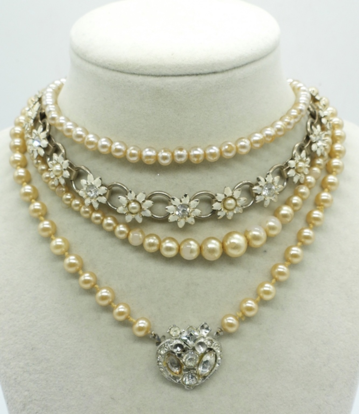 THREE STRANDS OF VINTAGE FAUX PEARLS, 14-16″. ONE SILVER TONE VINTAGE DAISY NECKLACE, 14″.