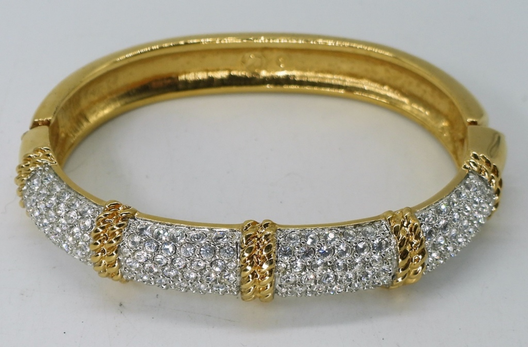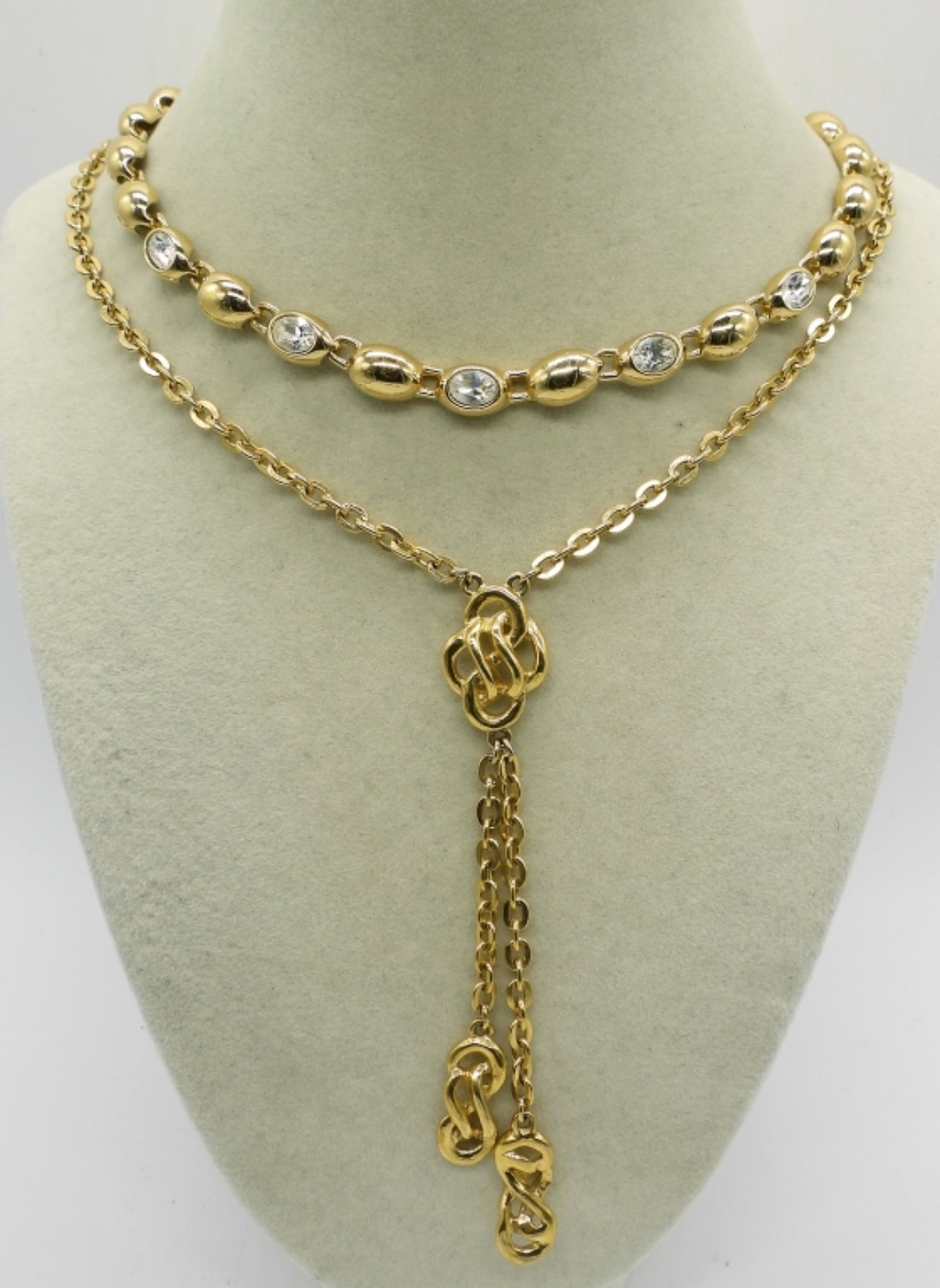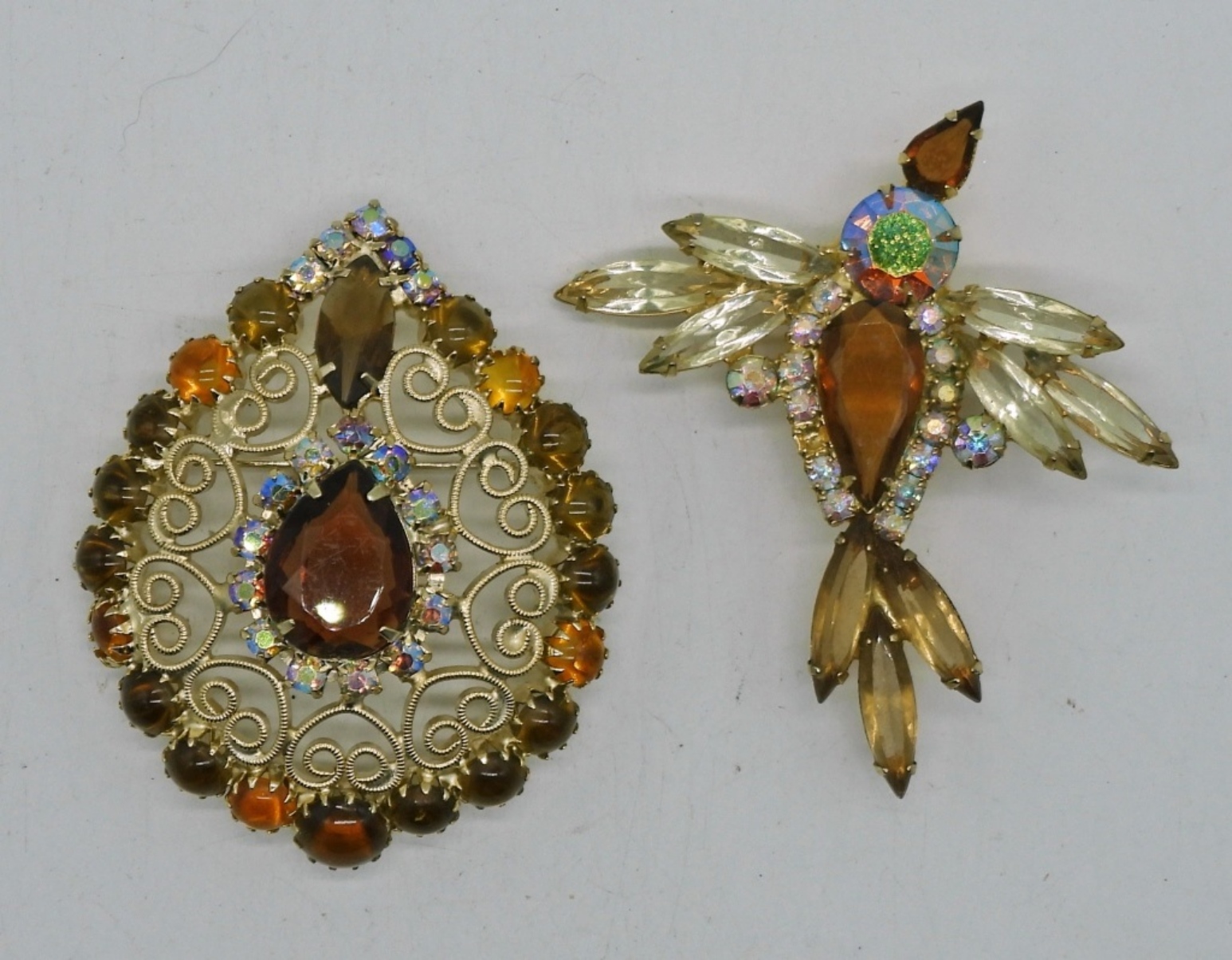 TWO VINTAGE BROOCHES, GOLD TONE WITH BROWN & ORANGE RHINESTONES, 2.5″. VTG GOLD TONE WHITE RHINESTONE CUFF BRACELET. TWO VINTAGE GOLD TONE NECKLACES, 20″ & 30″.