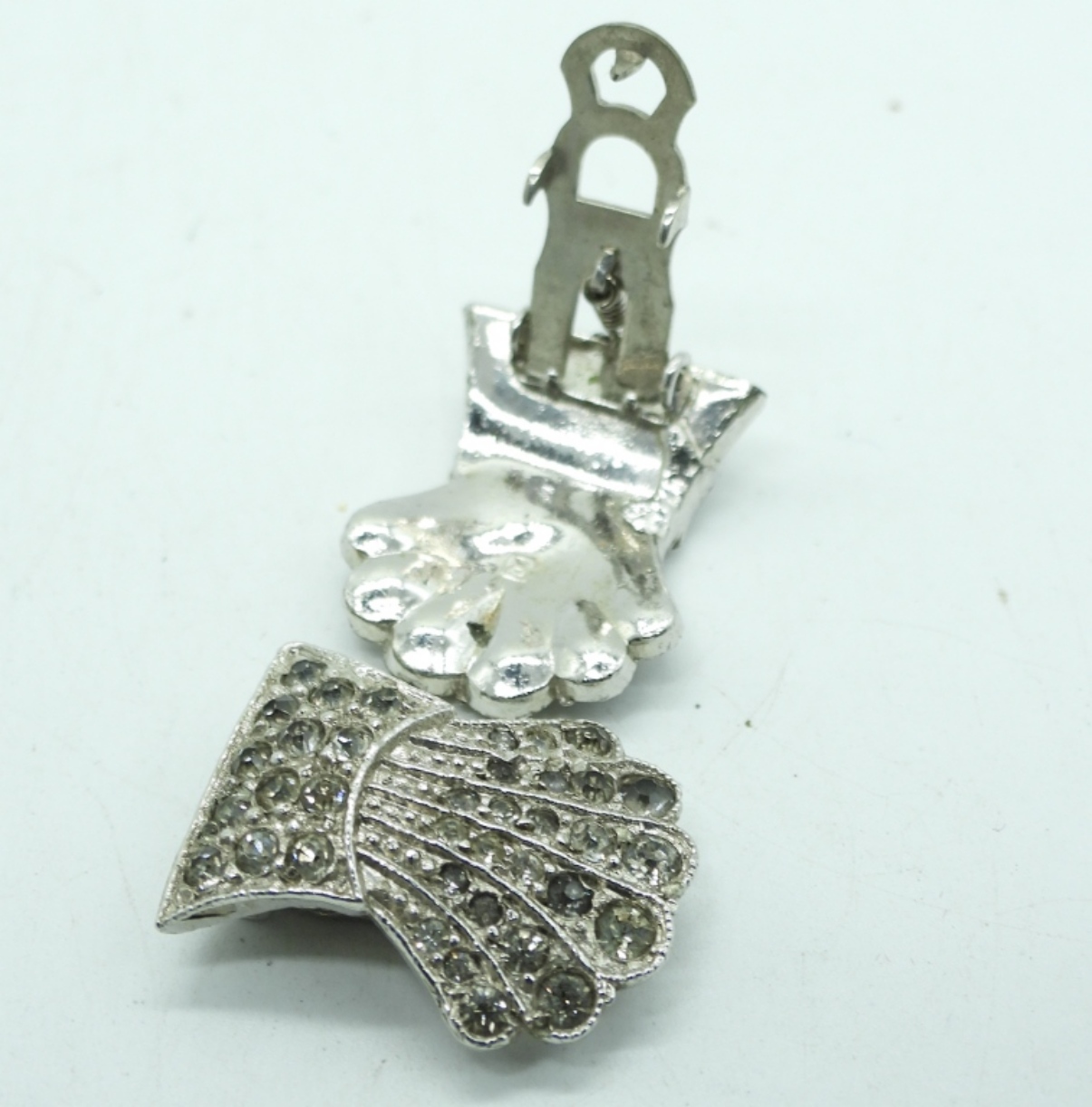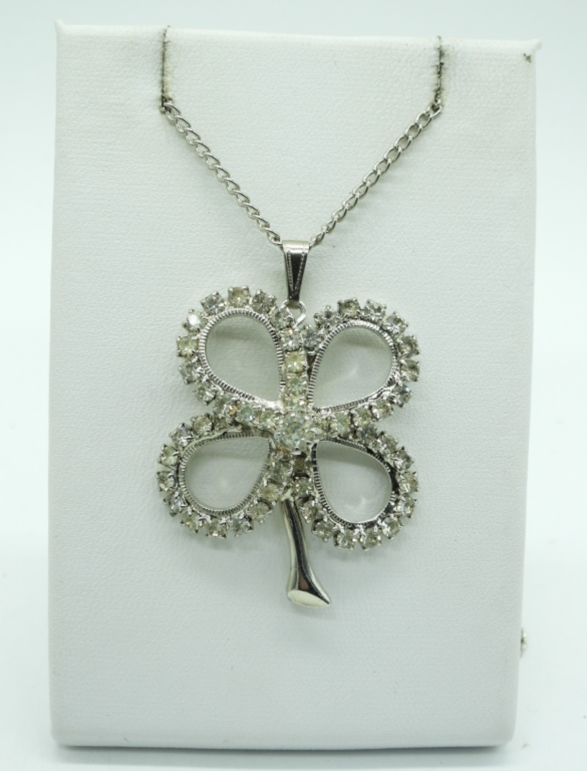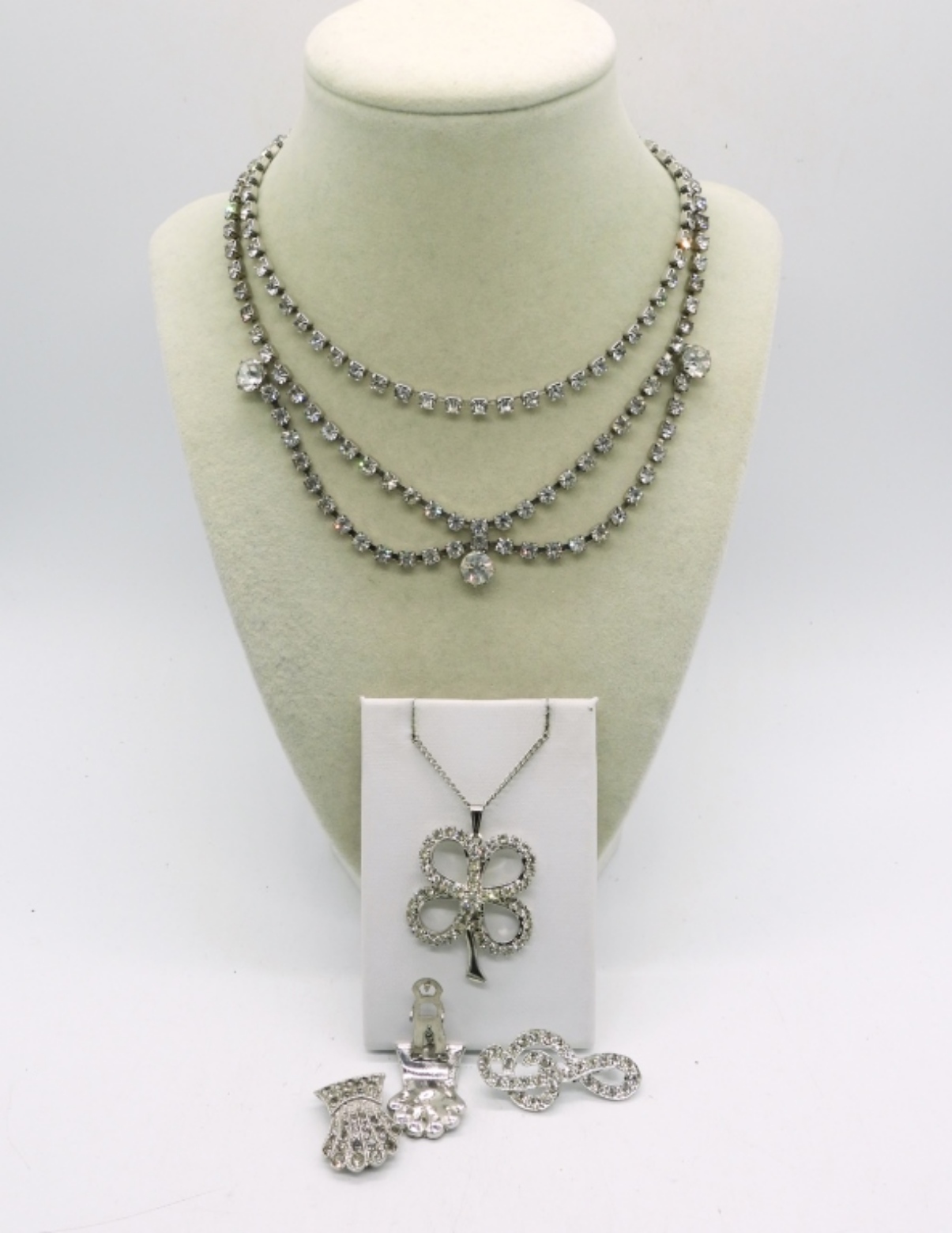 TWO VINTAGE RHINESTONE CHOKERS, 13″ & 16″. SILVER TONE RHINESTONE FOUR LEAF CLOVER NECKLACE, 18″. MUSIC NOTE PIN AND A PAIR OF SILVER TONE RHINESTONE SHOE CLIPS.