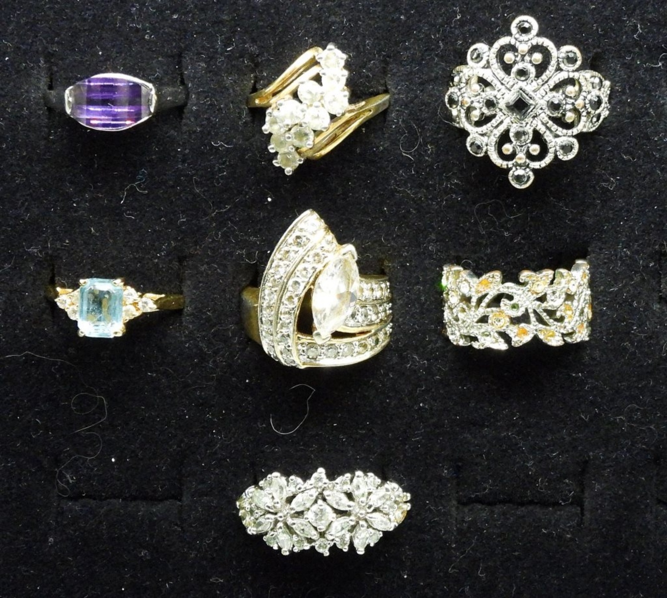 SEVEN SILVER AND GOLD TONE LADIES FASHION COSTUME RINGS. SIZES 6-9