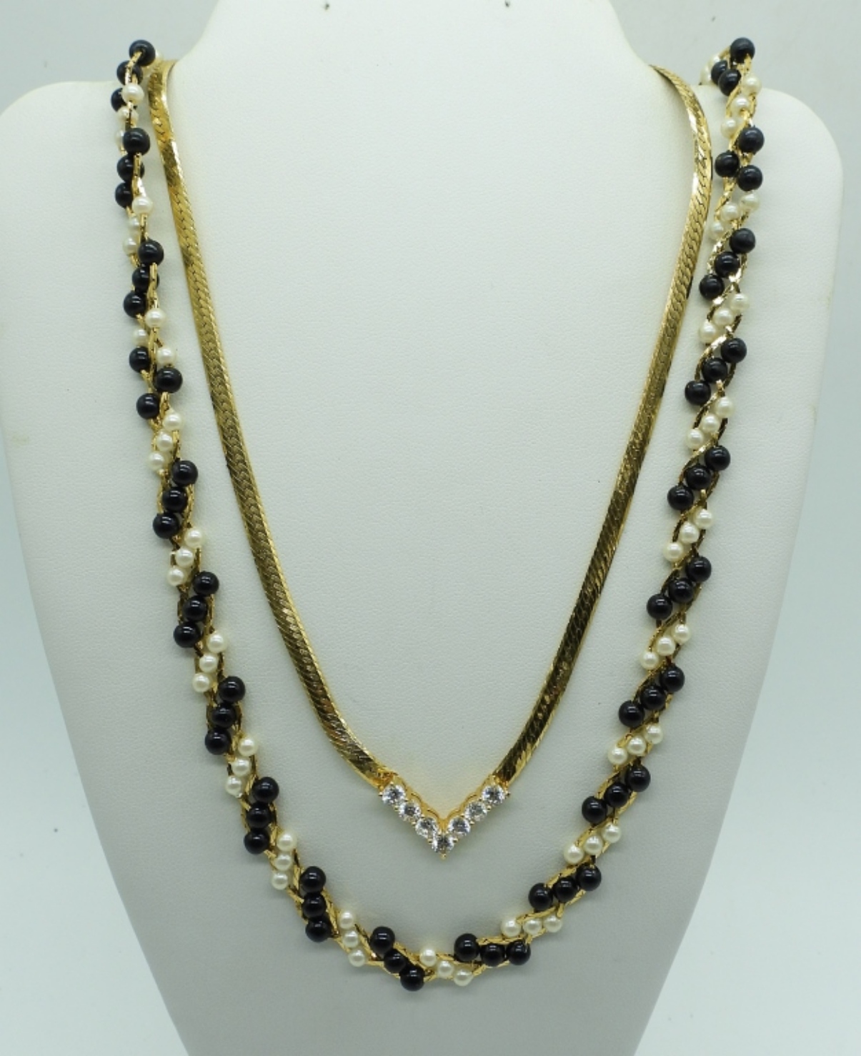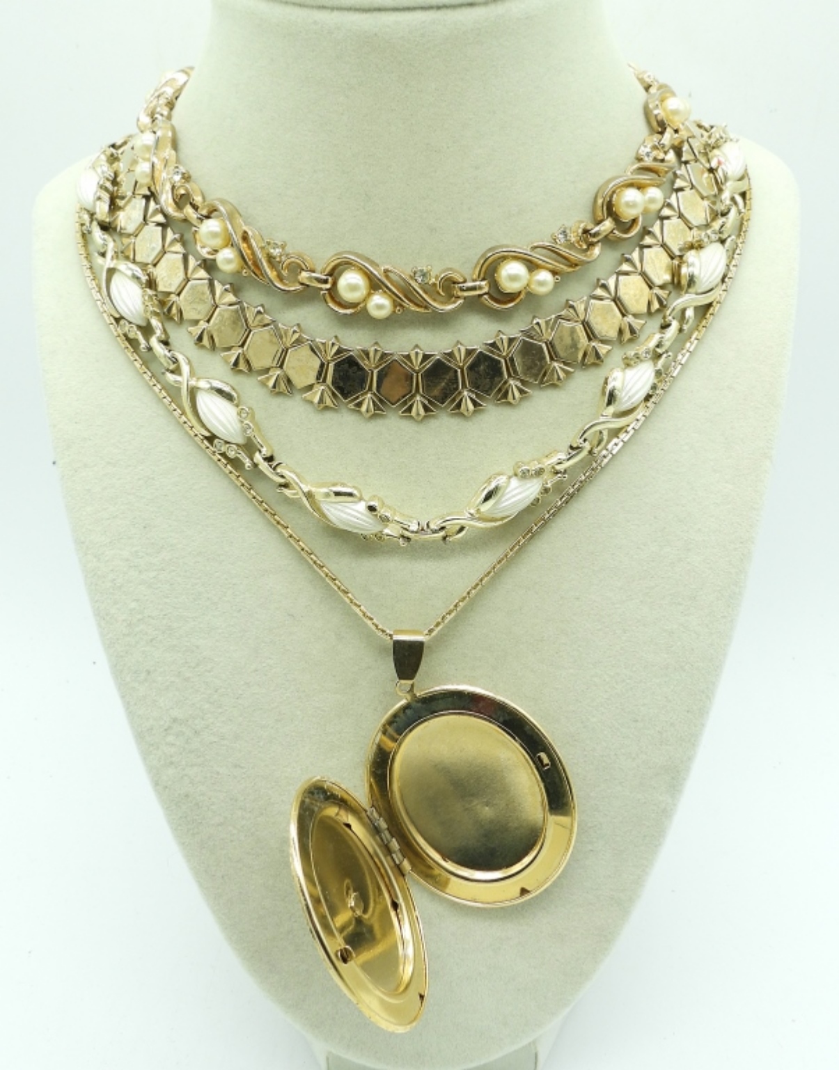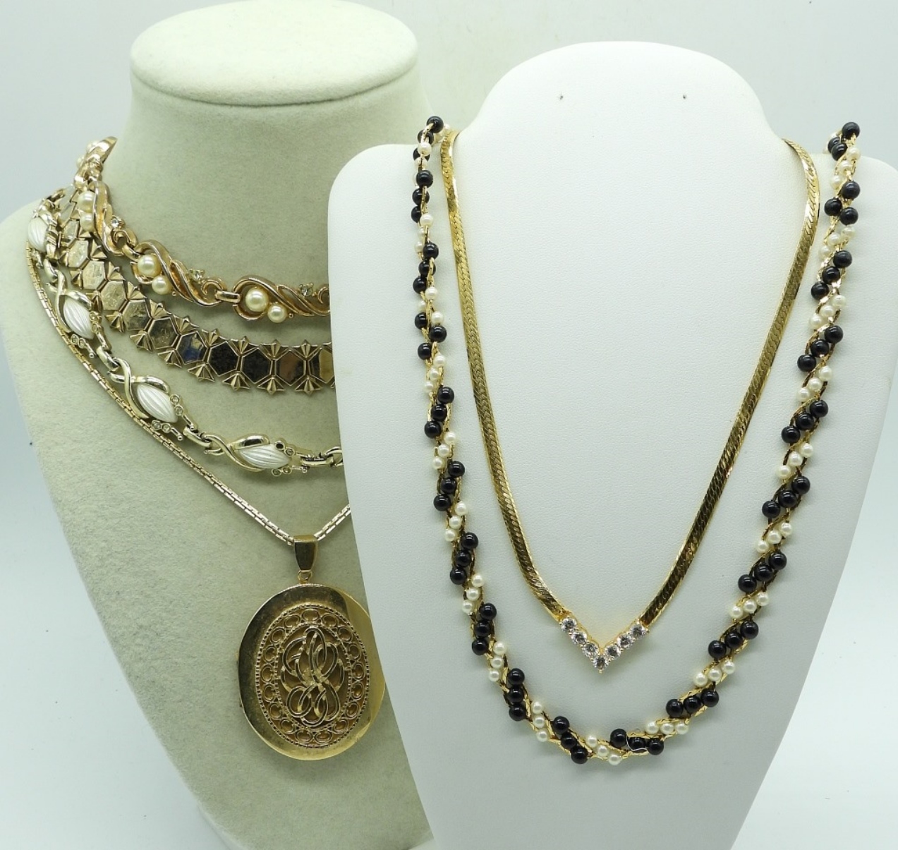 SIX VINTAGE GOLD TONE NECKLACES, PEARLS, BEADS, LOCKET. 16-24″.
