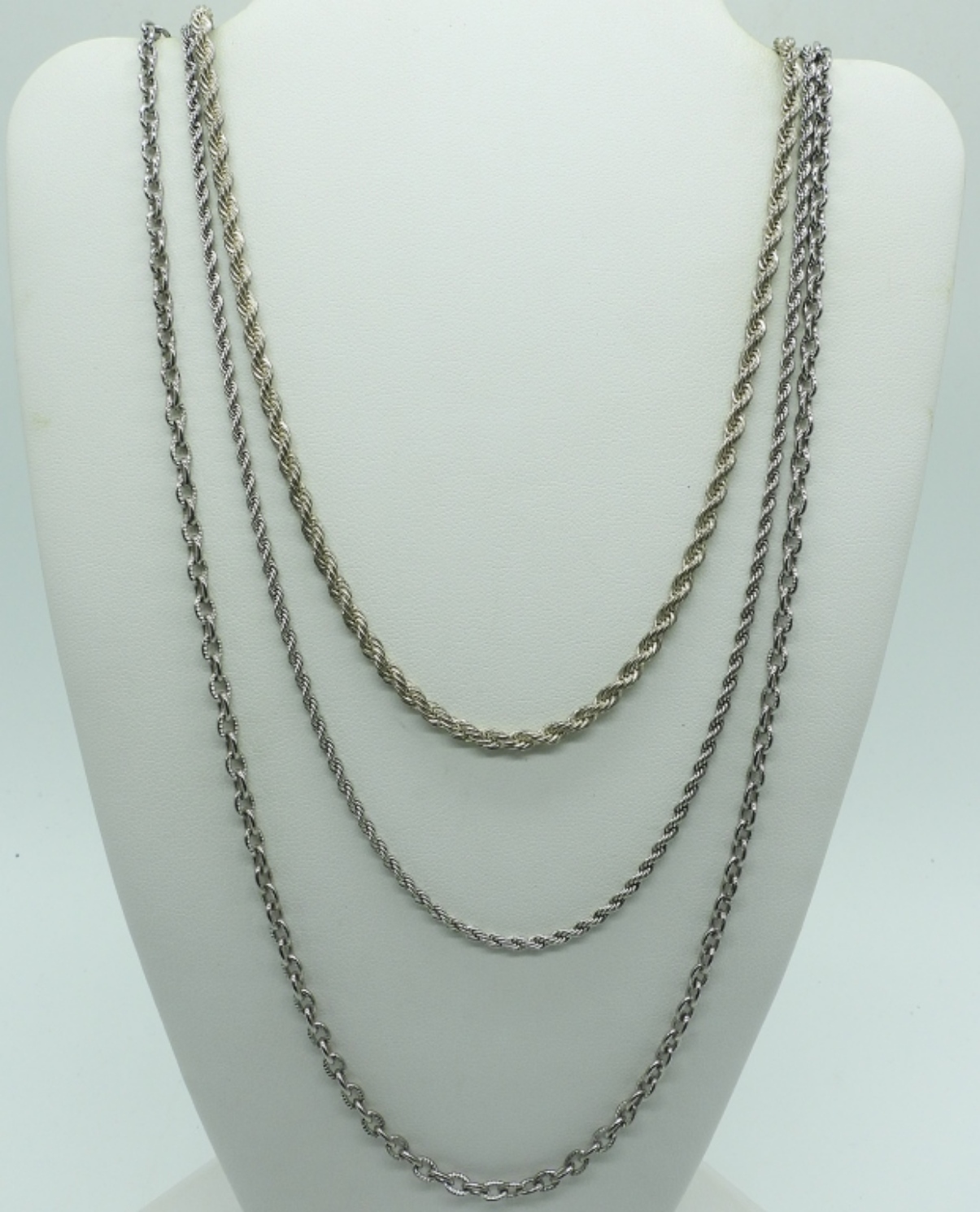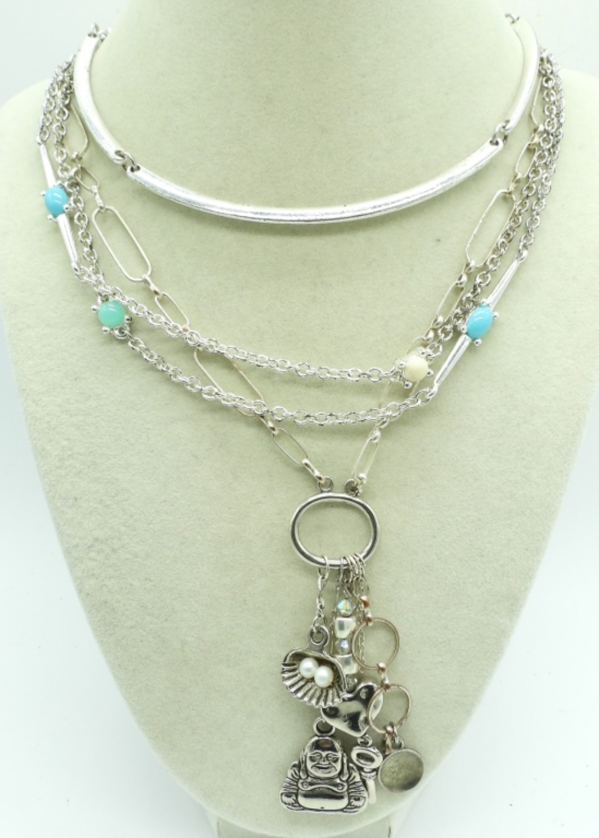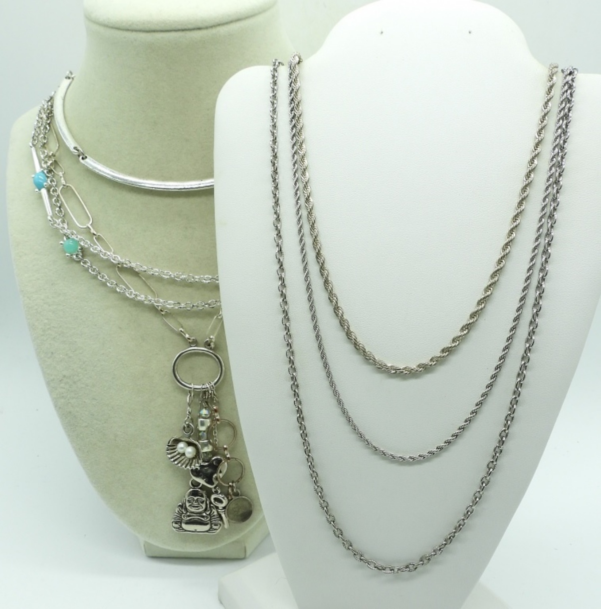 SIX SILVER TONE FASHION NECKLACES, CHAINS, CHARMS. 19-34″.