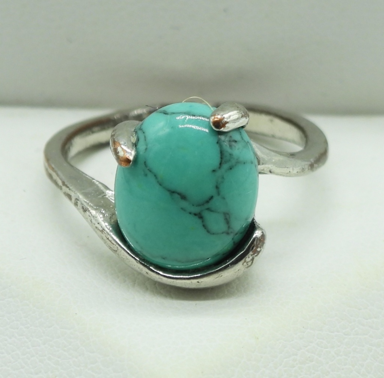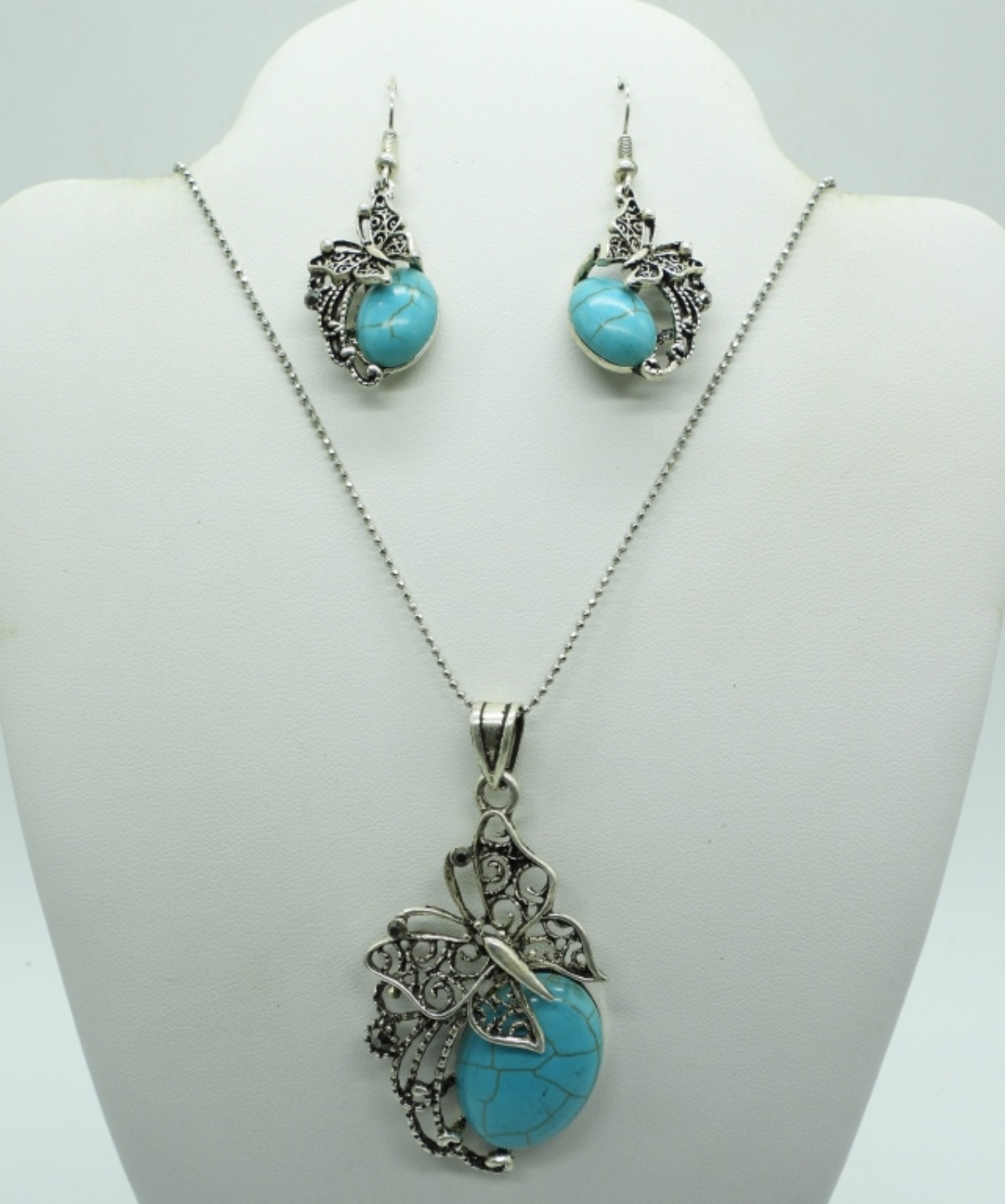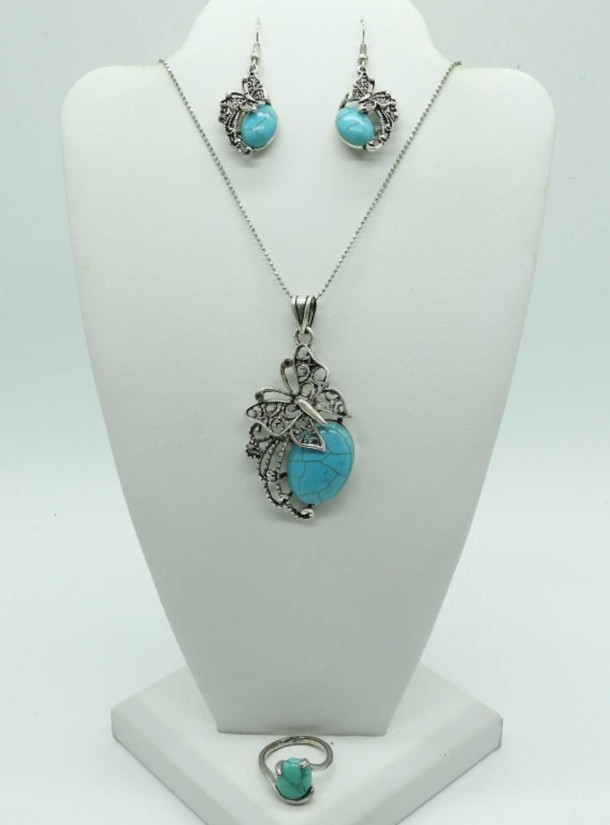 SILVER TONE BUTTERFLY FAUX TURQUOISE NECKLACE, EARRING & RING SET. NECKLACE IS 18″. RING SIZE 8.