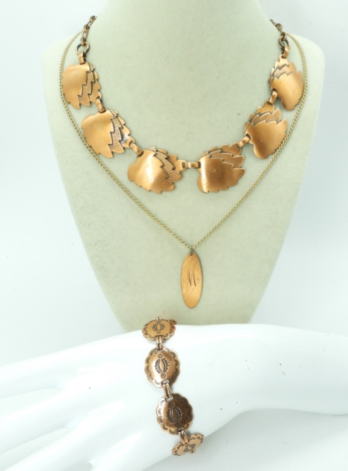 TWO VINTAGE COPPER NECKLACES, 16.5″ & 18″. COPPER BRACELET WITH TAG 7.5″.