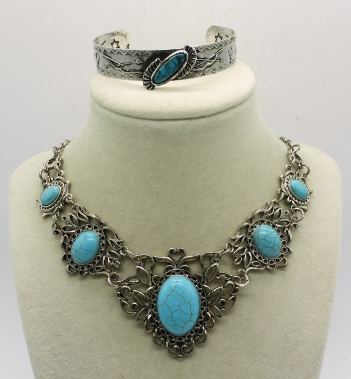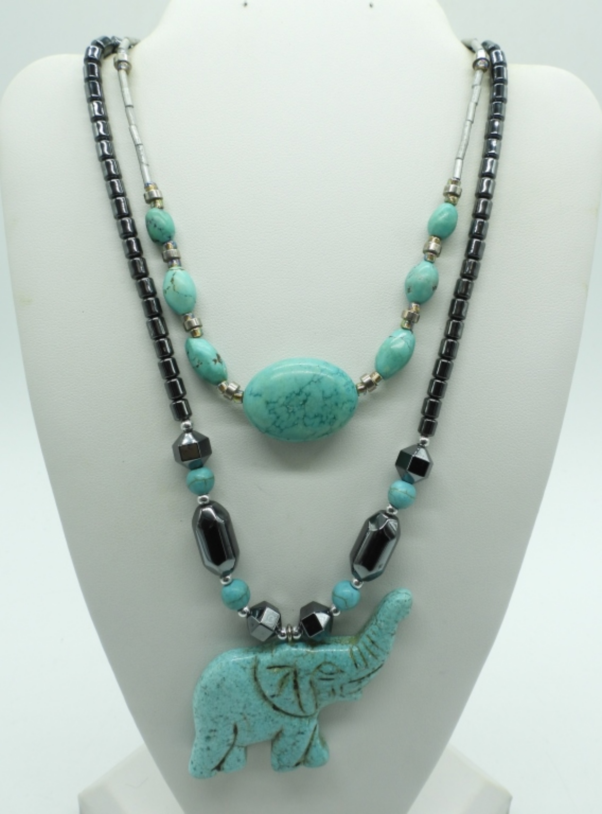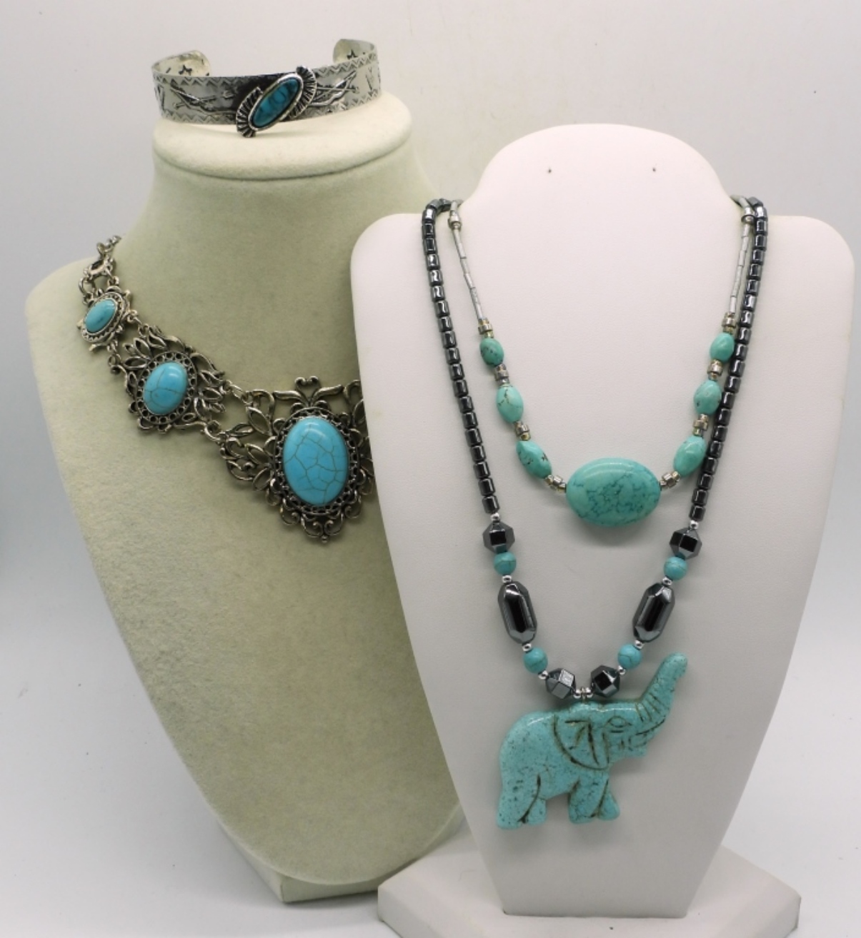 3 COSTUME NECKLACES, FAUX TURQUOISE & HEMATITE, 17″ 19″ 21″. ONE SILVER TONE FAUX TURQUOISE CUFF BRACELET, 8″