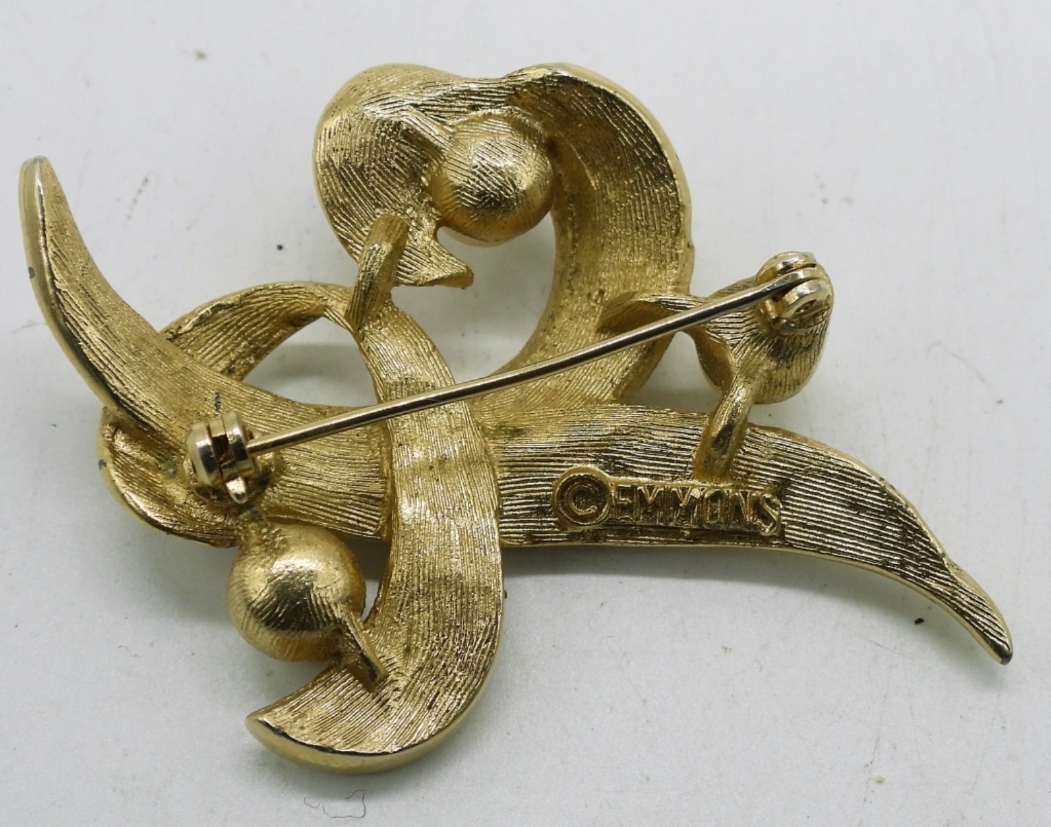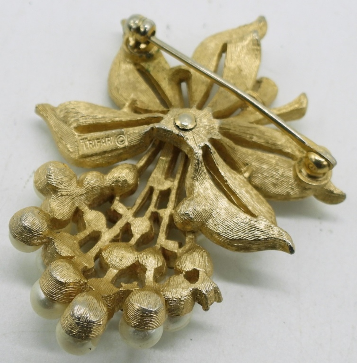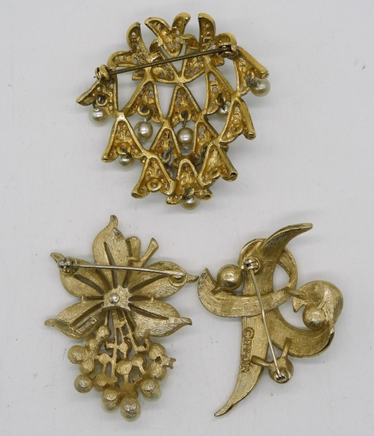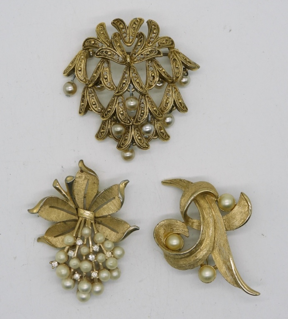 TRIFARI GOLD TONE PEARL BROOCH, 2″. EMMONS GOLD TONE PEARL BROOCH, 2″. UNBRANDED GOLD TONE & PEARL BROOCH, 2″.
