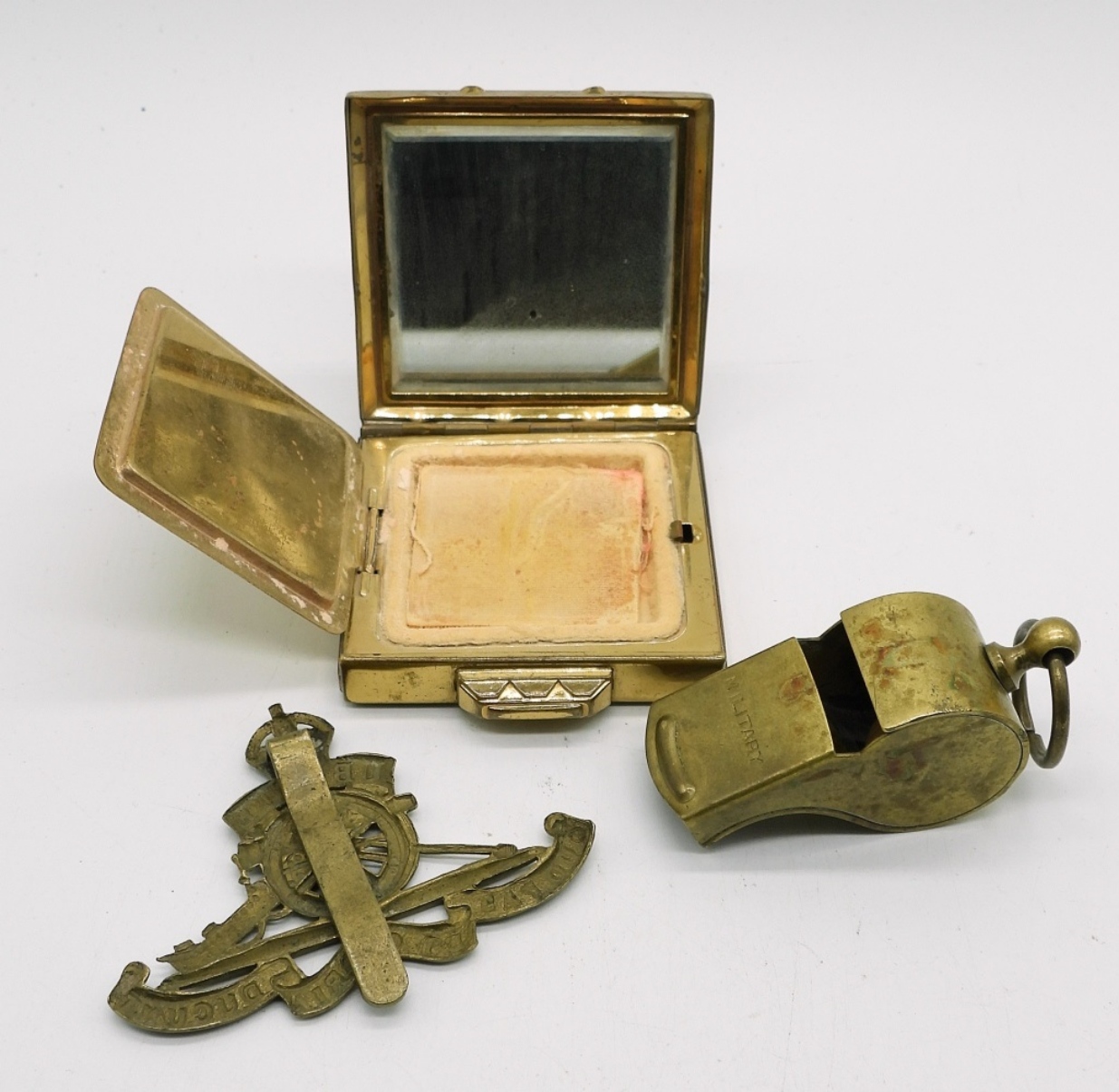 USN GOLD TONE POWDER COMPACT, 2 1/4″. VINTAGE GOLD TONE CAP BADGE-MIGHT BE MILITARY, 2.5″. GOLD TONE MILITARY WHISTLE, 3″ (ENGRAVED ‘MILITARY MADE IN USA’)