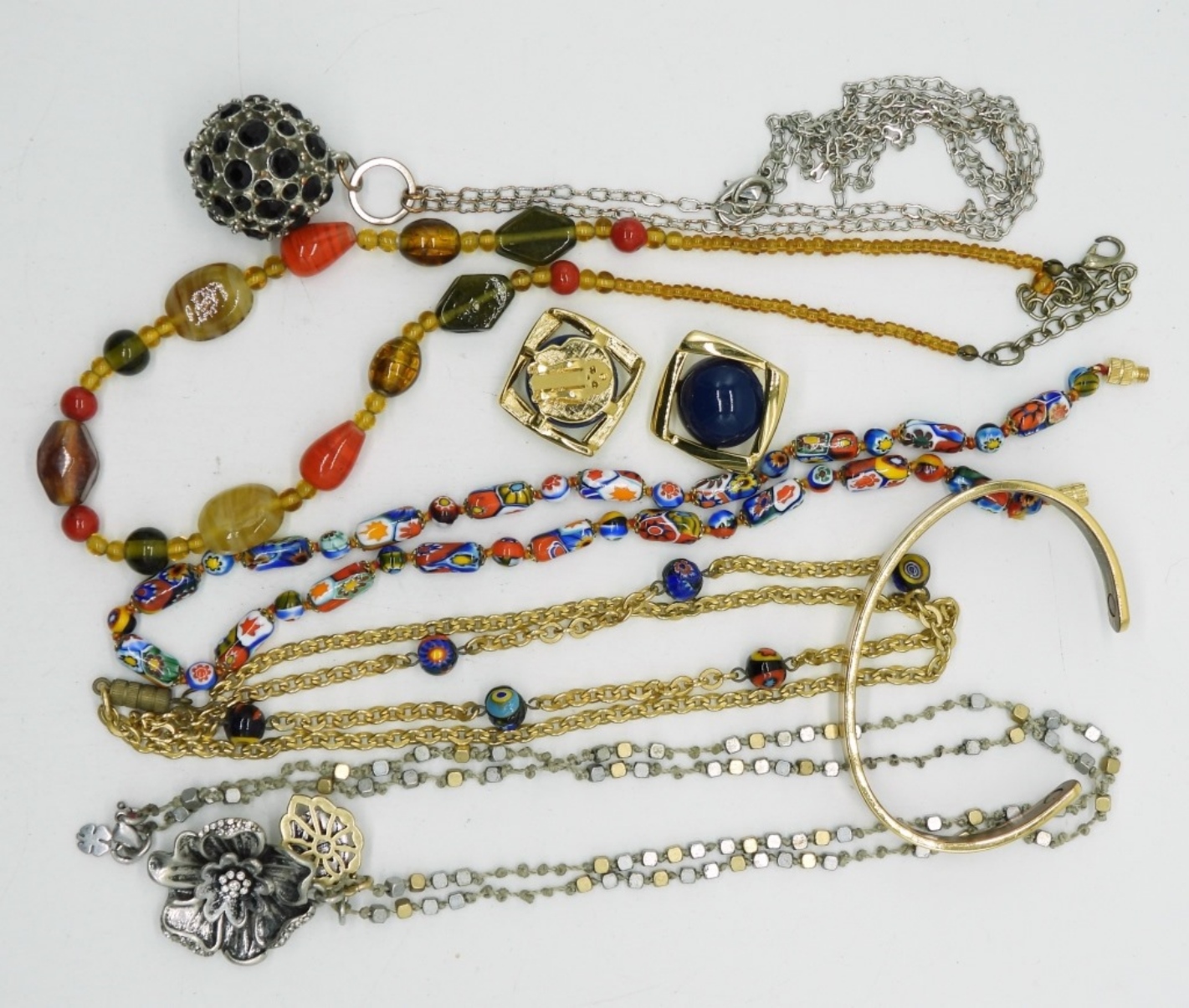 5 COLORFUL VINTAGE NECKLACES, 16-30″. MAGNETIC TRI TONE CUFF BRACELET & ONE PAIR OF GOLD TONE BLUE ACCENT CLIP ON VTG EARRINGS.