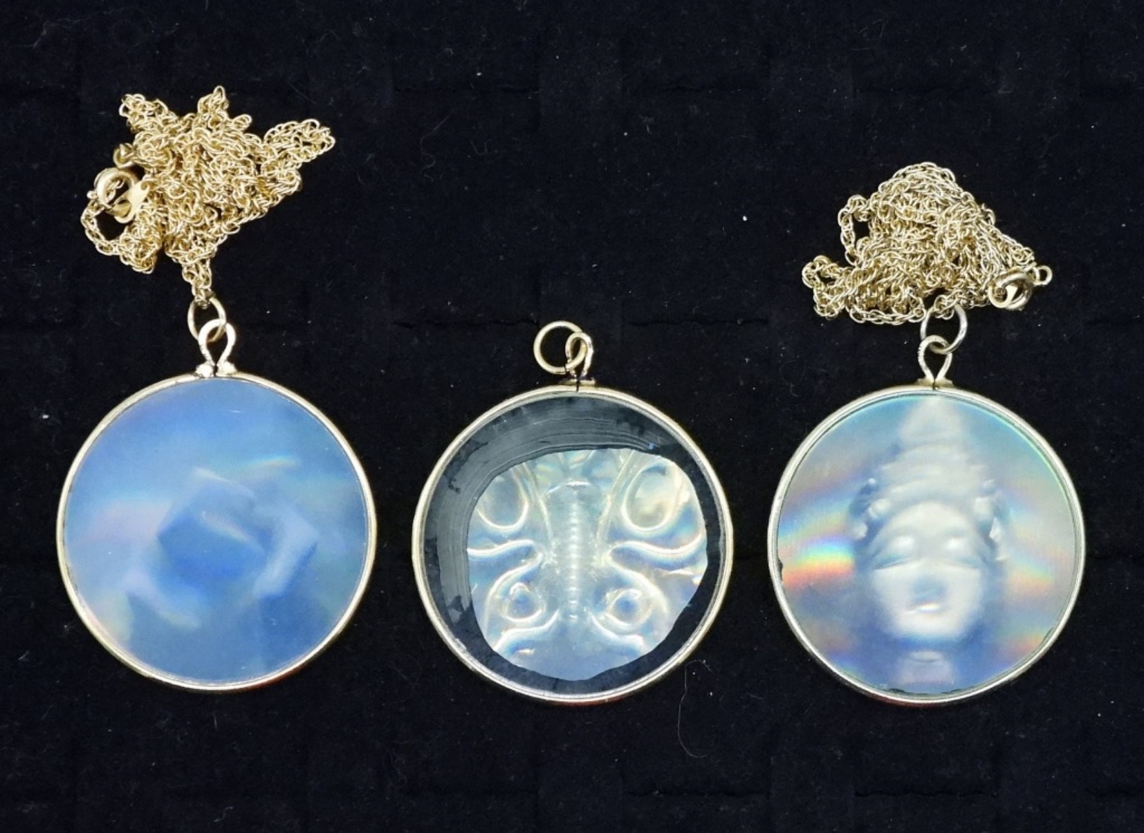 THREE GOLD TONE HOLOGRAPHIC PENDANTS ON TWO GOLD TONE CHAINS, 24″.