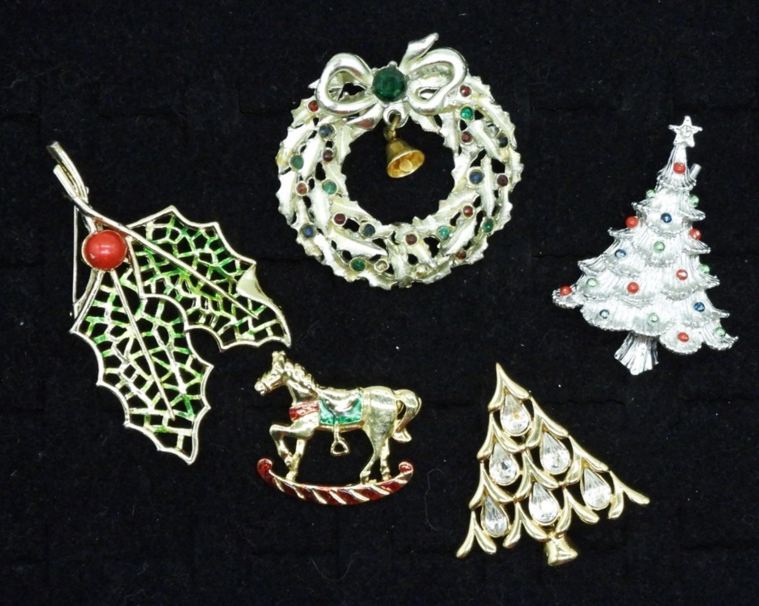 FIVE VINTAGE GOLD AND SILVER TONE HOLIDAY BROOCHES. 1″-3″.
