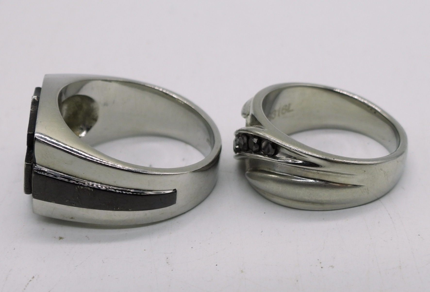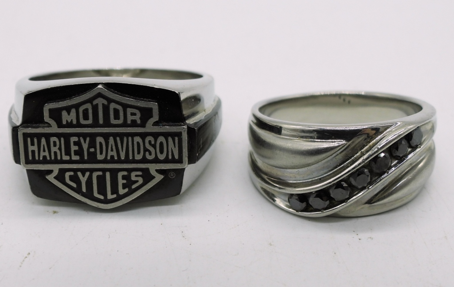 HARLEY DAVIDSON RING, SIZE 12.5 AND A SILVER TONE FAUX BLACK DIAMOND BAND, SIZE 10