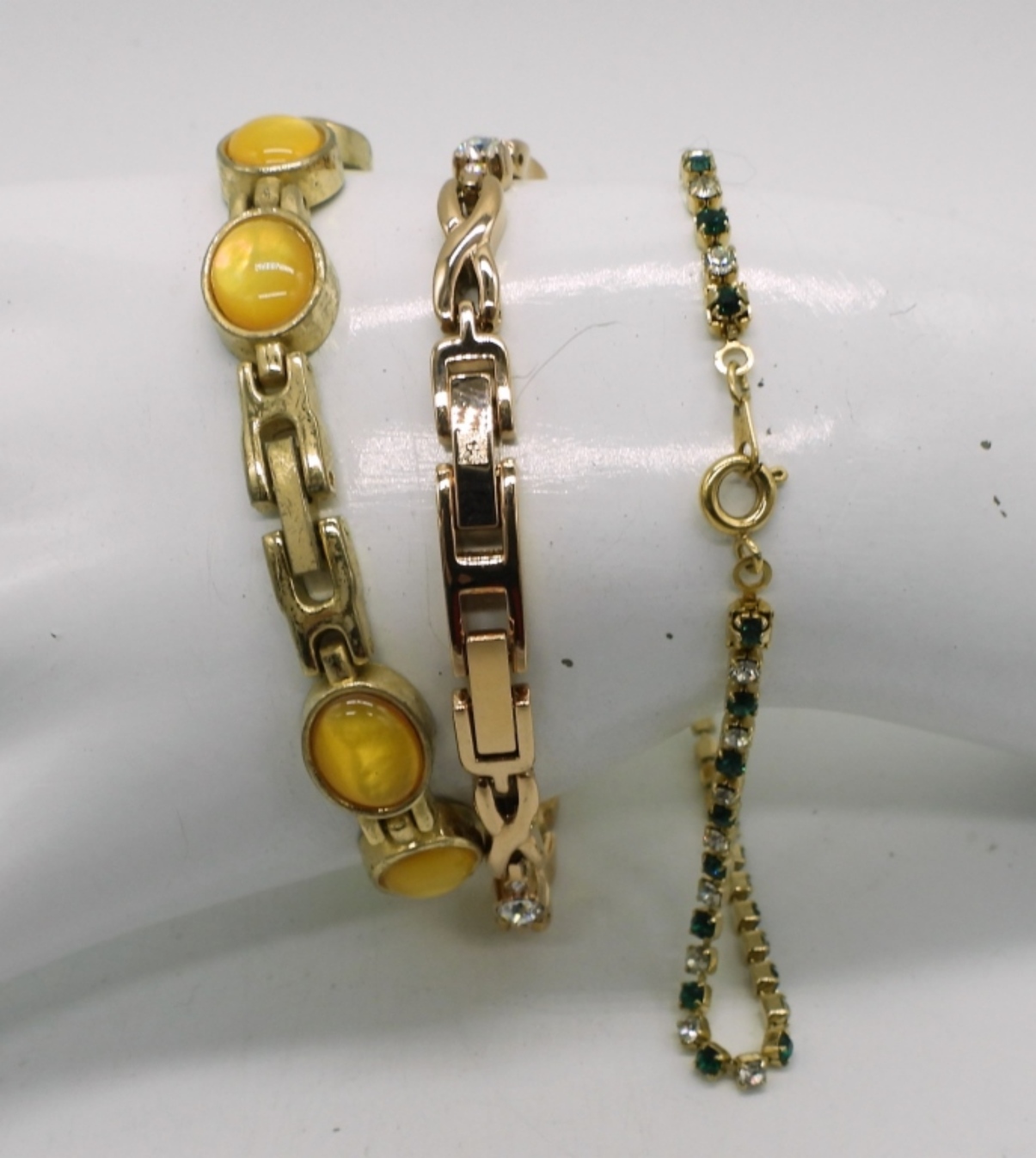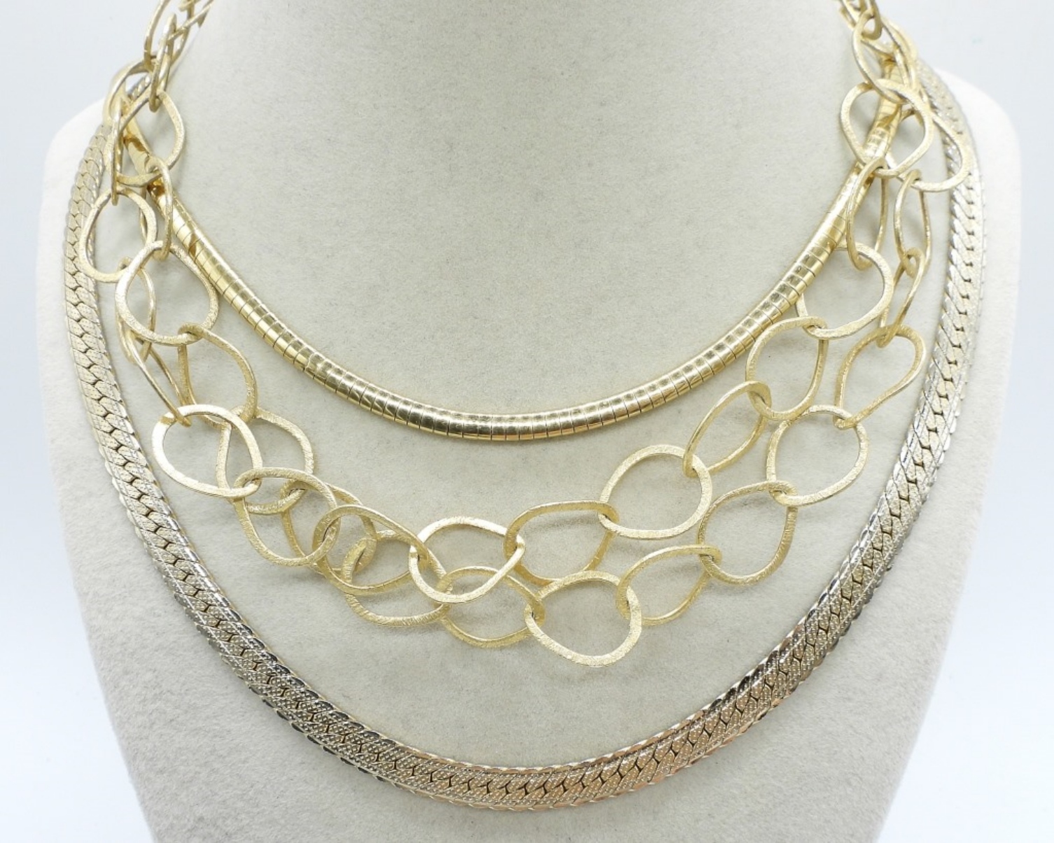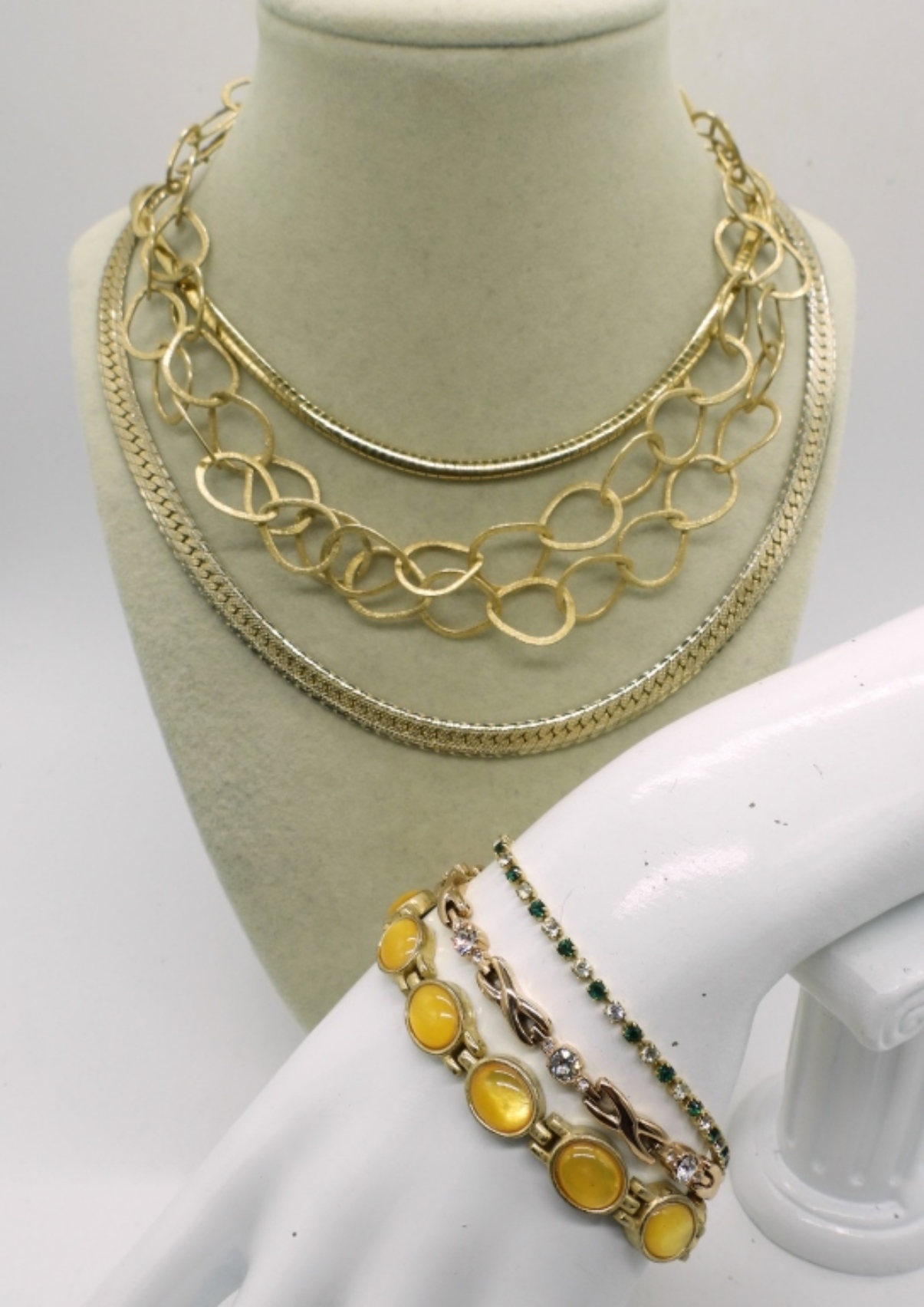 THREE GOLD TONE CHAIN NECKLACES, 17″, 24″ & 30″. THREE GOLD & ROSE GOLD TONE BRACELETS. 7.5″