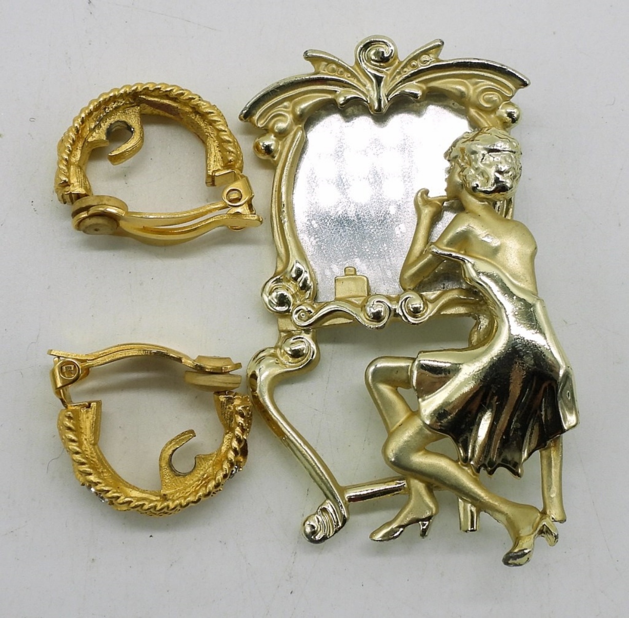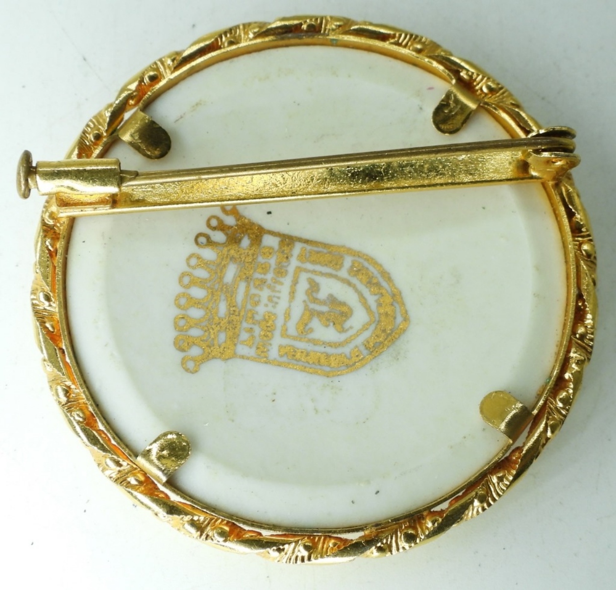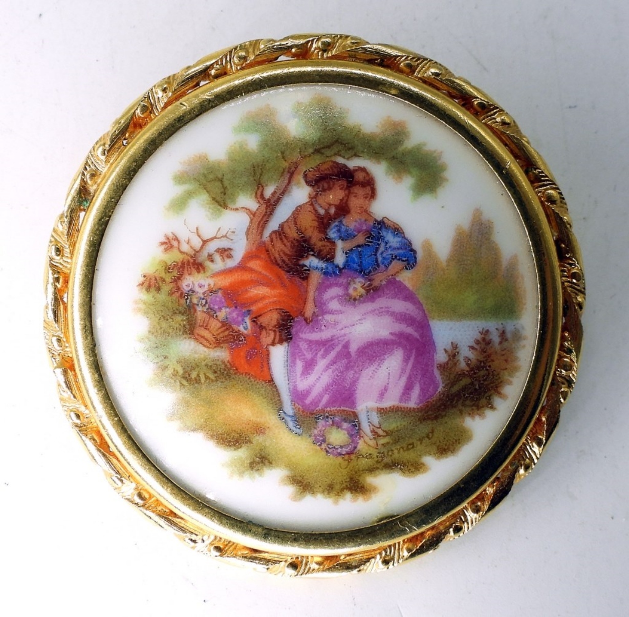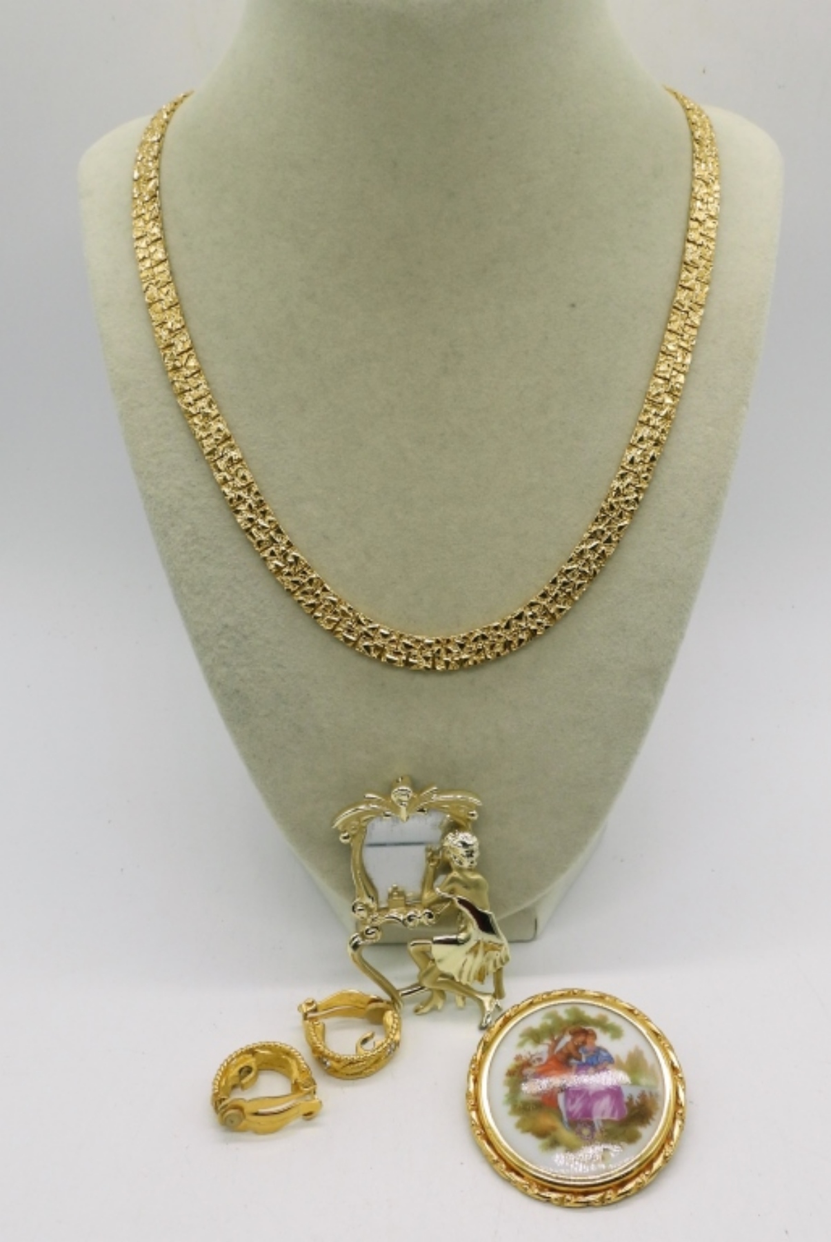 LIMOGES COURTING COUPLE PORCELAIN BROOCH WITH TROMBONE CLASP, 2″. GOLD TONE NECKLACE, 23″. WOMAN AT VANITY BROOCH, 2.5″.